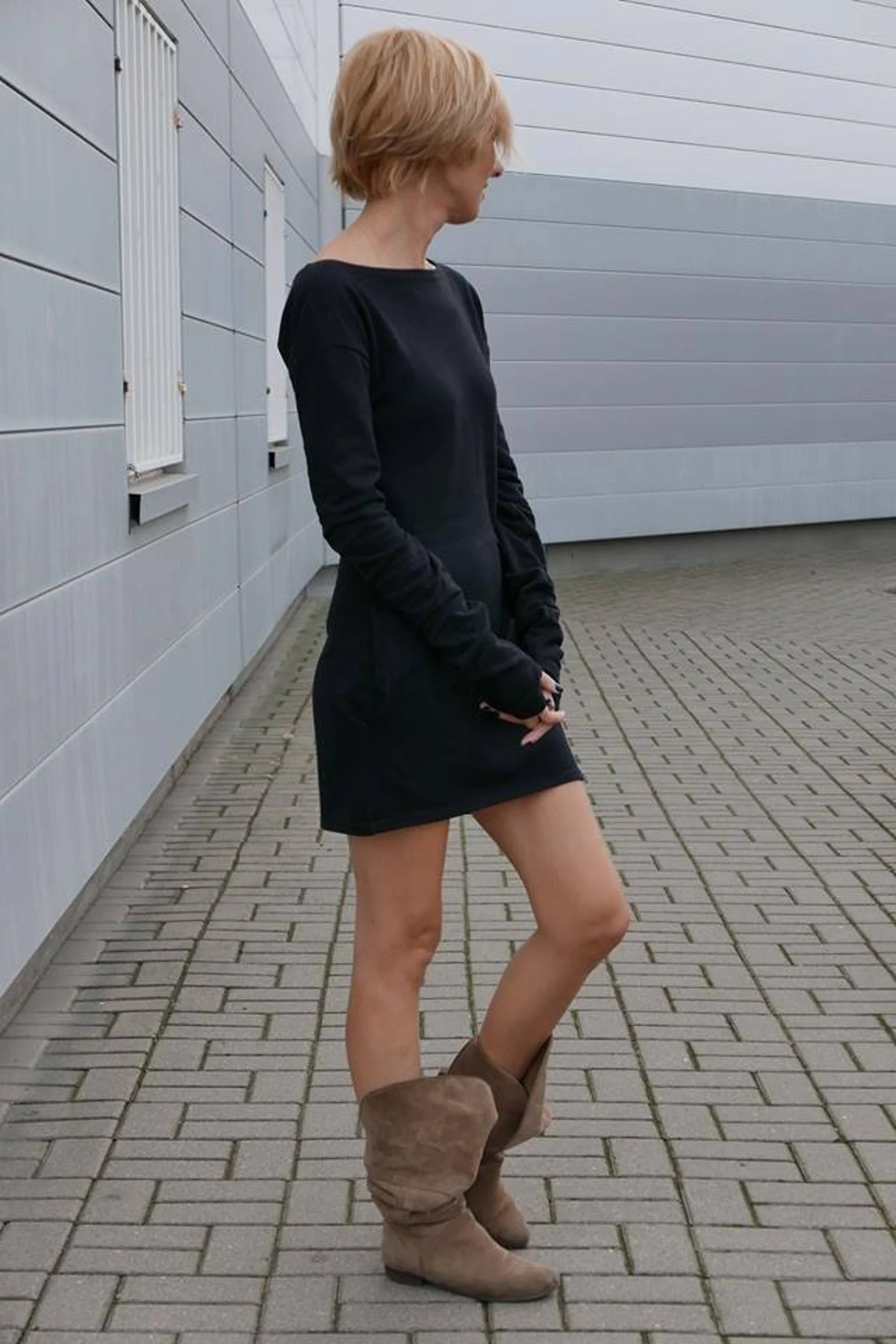 Summer Fashion Mini 100% Cotton Dress With Long Sleeves Fingerless Gloves Black Mini Dress Short Dress Wholesale One Piece Set
