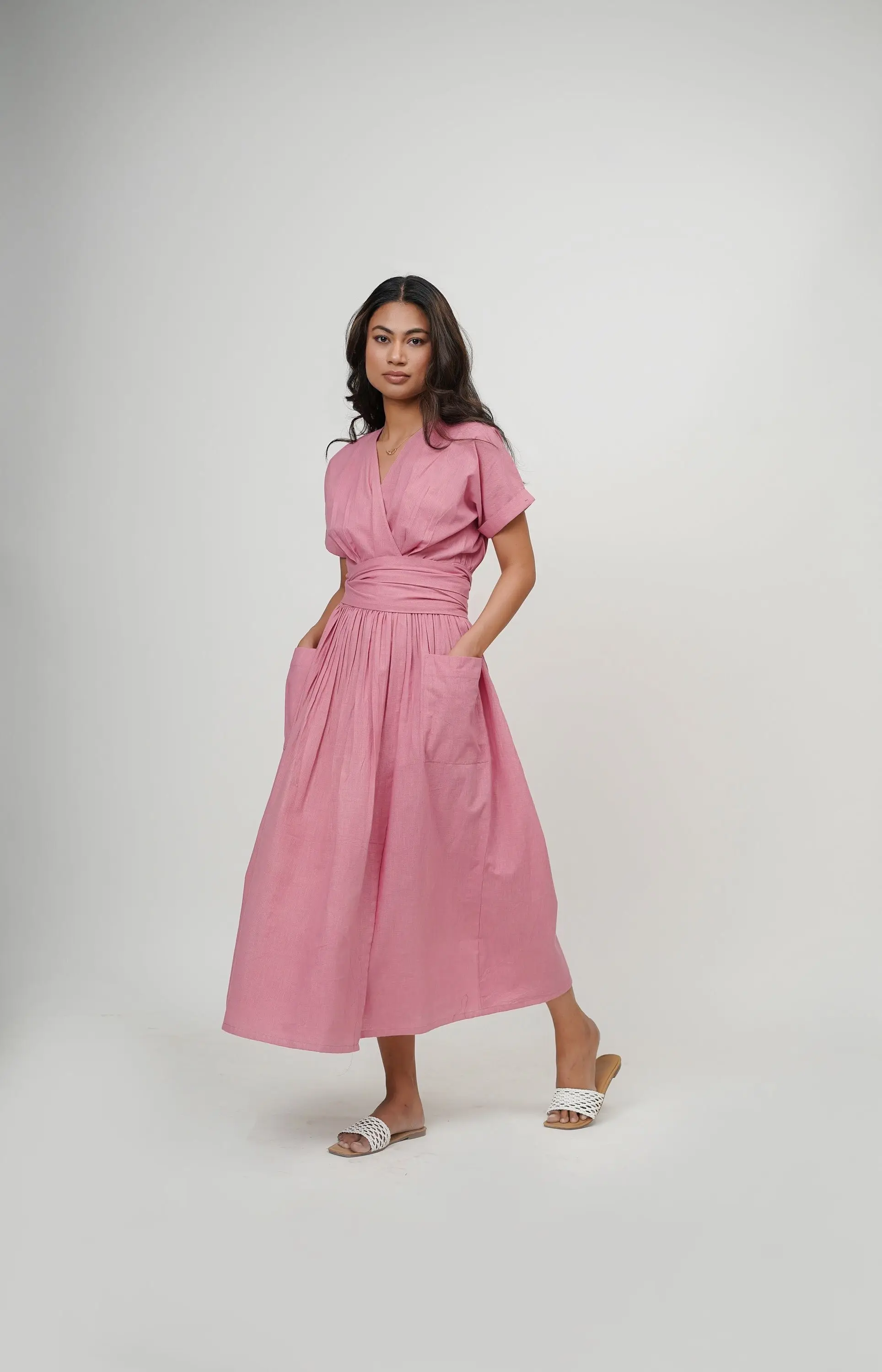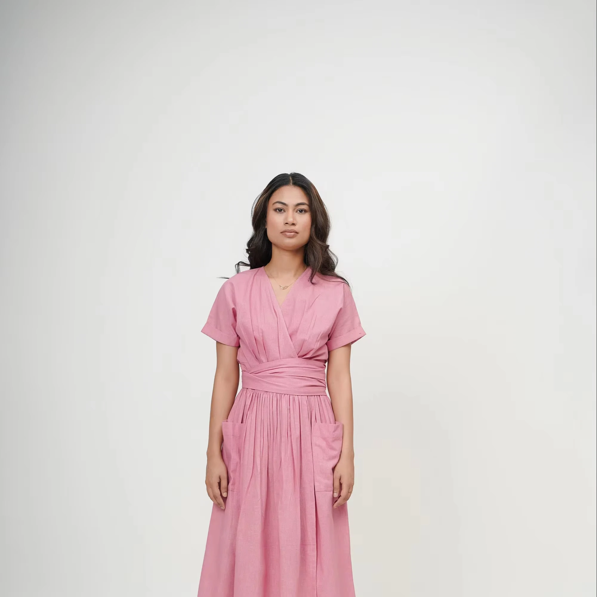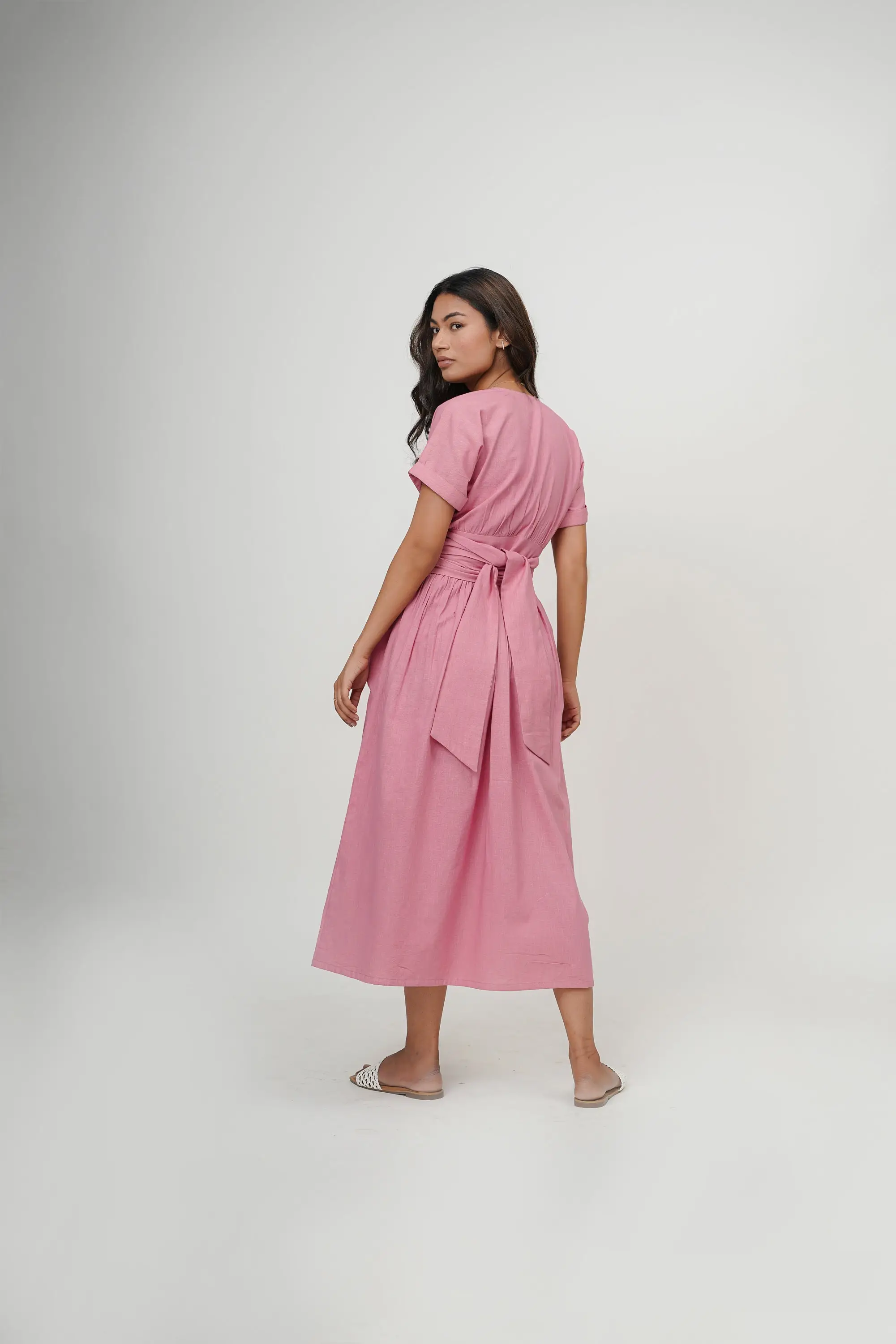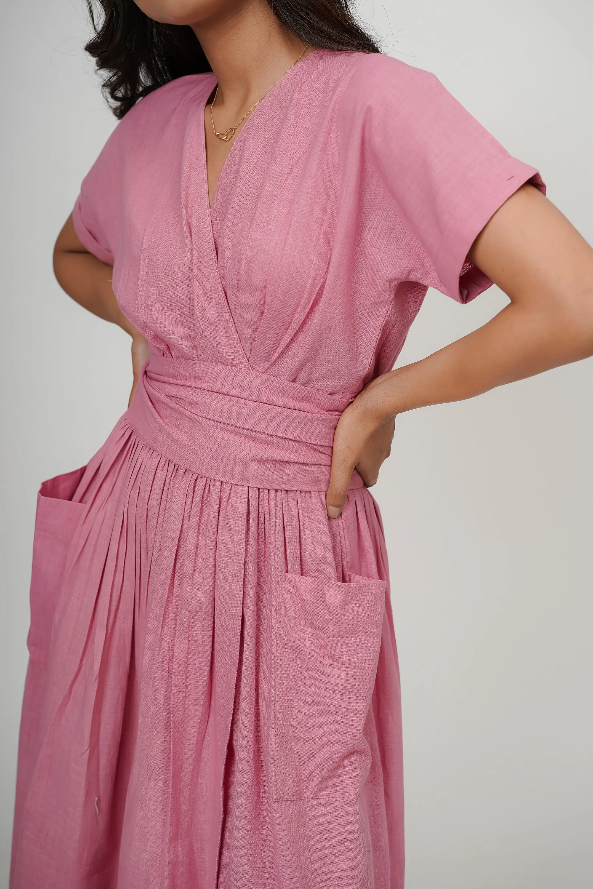 Summer Eco-Friendly Natural Waist Wrap Dress Cotton Pink V-Neck Long Slit Tunic Tie-Up Belt Short Sleeves Deep Neck Midi Knot