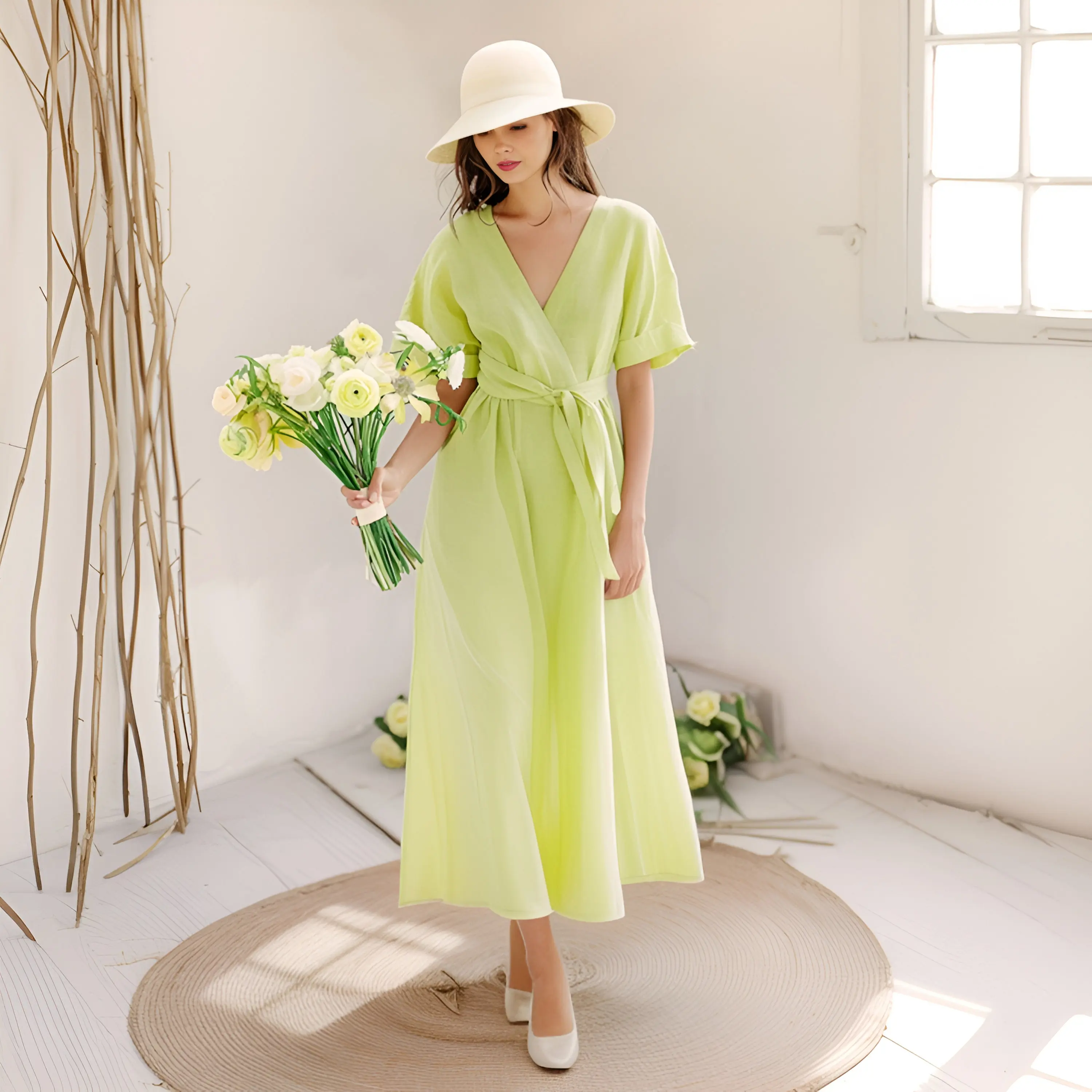 Pure Color Solid Casual Midi Dress V-Neck Puff Short Sleeves Elegant Plain Cotton Belted Long Dress Natural Waistline Woven