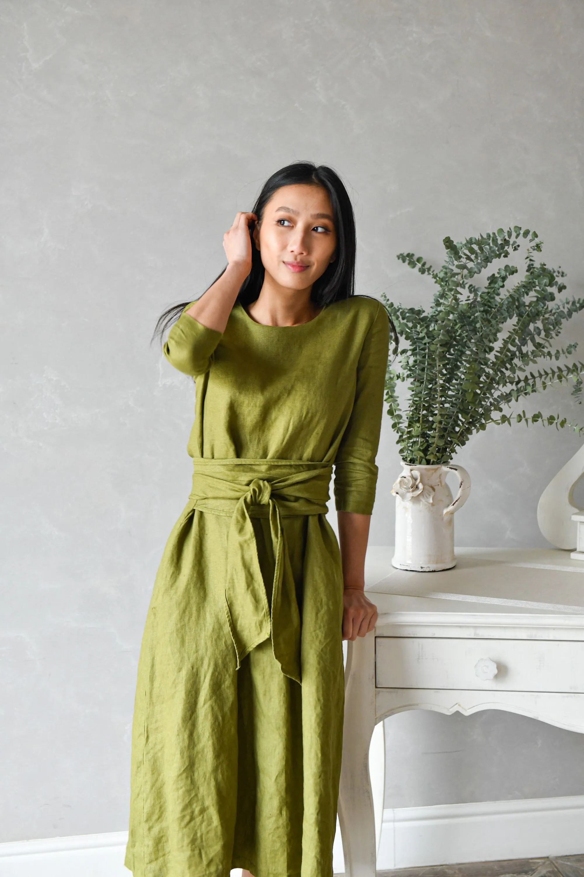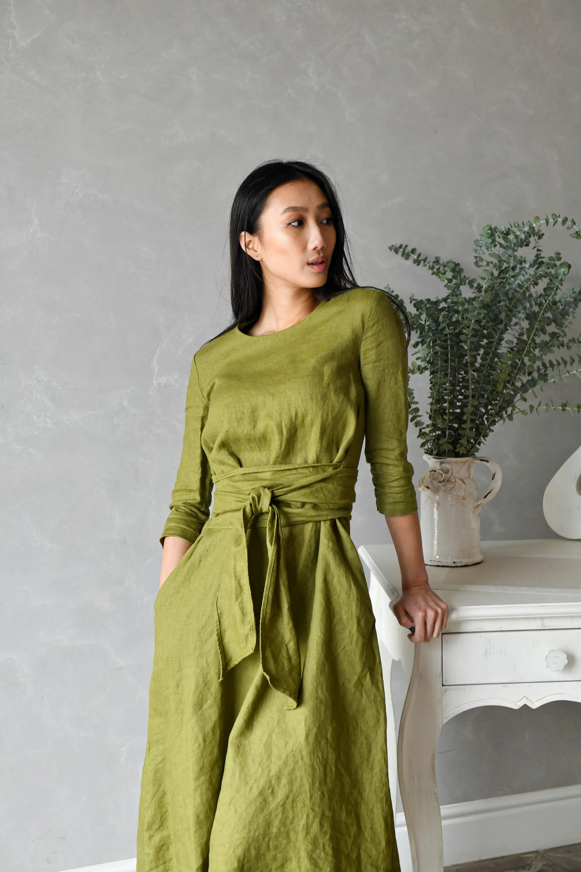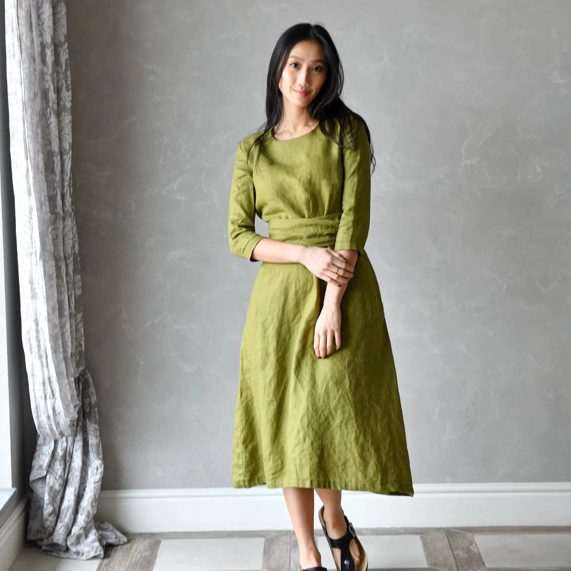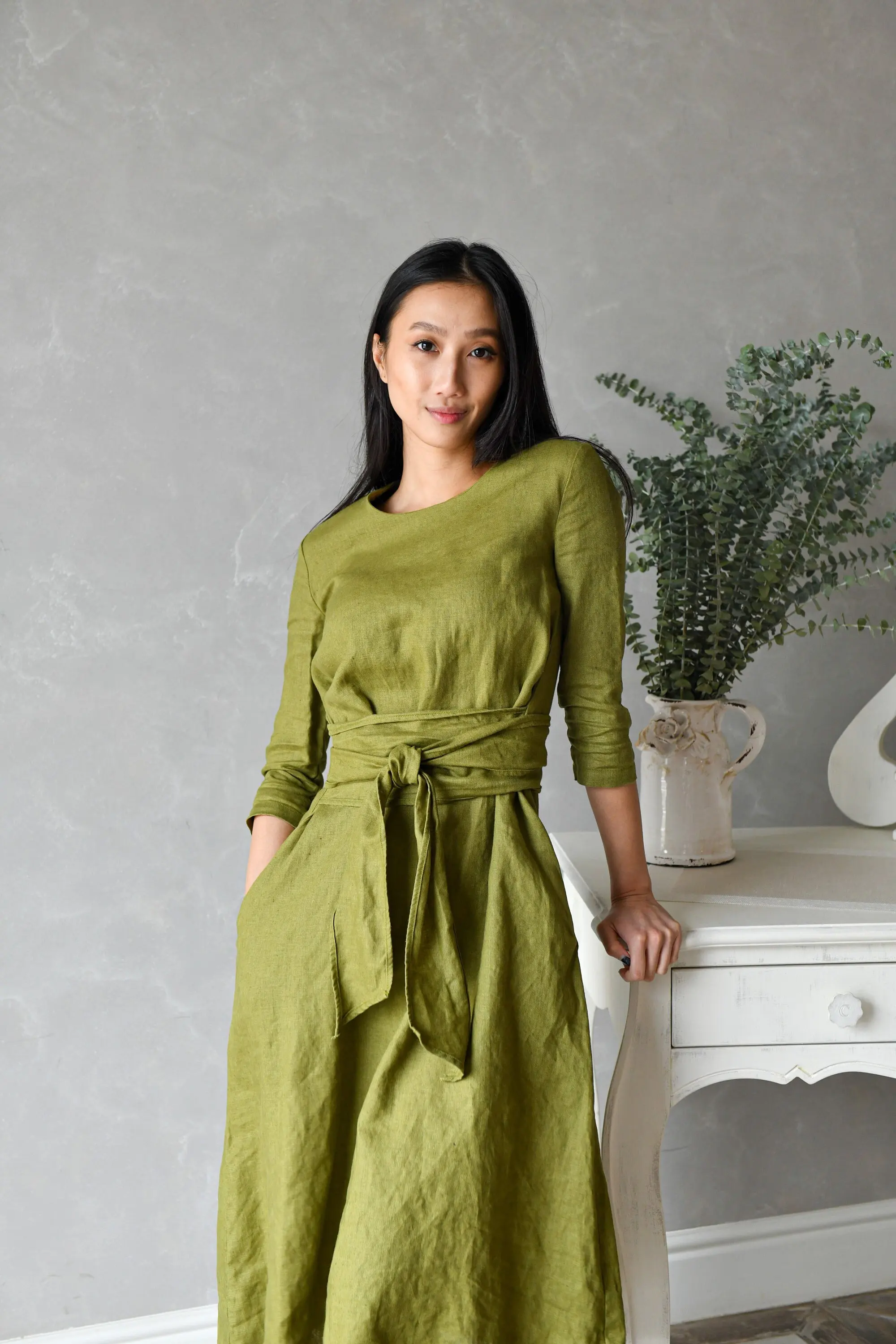 High Quality Custom Green Giza Cotton Midi Dress Elegant Long Wrap Multiway Long Sleeve Pockets Eco-Friendly Breathable Natural