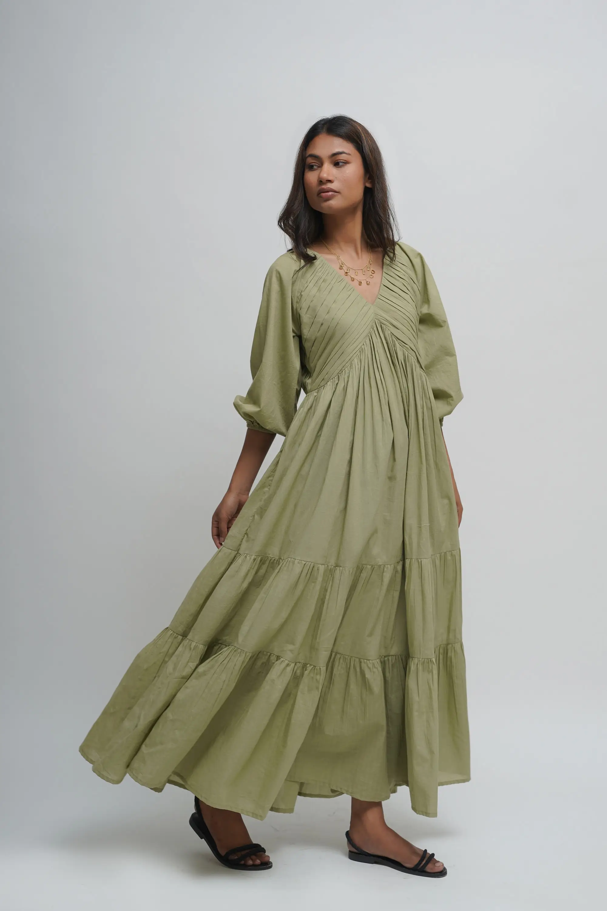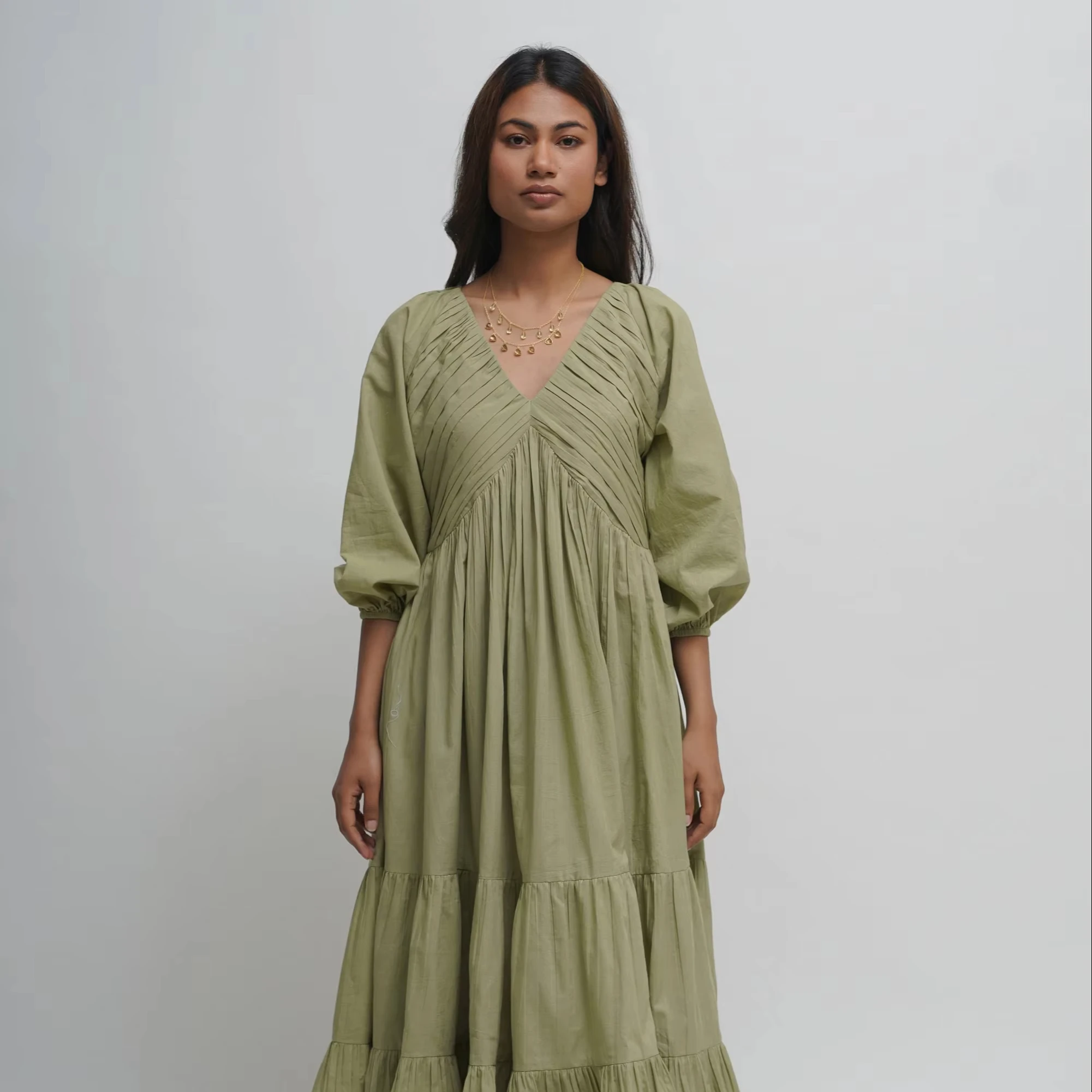 Natural Cotton Midi Dress Green Boho Tunic Pockets Tiered Layered Formal Casual Long Woven Weaving Method Long Midi Dress