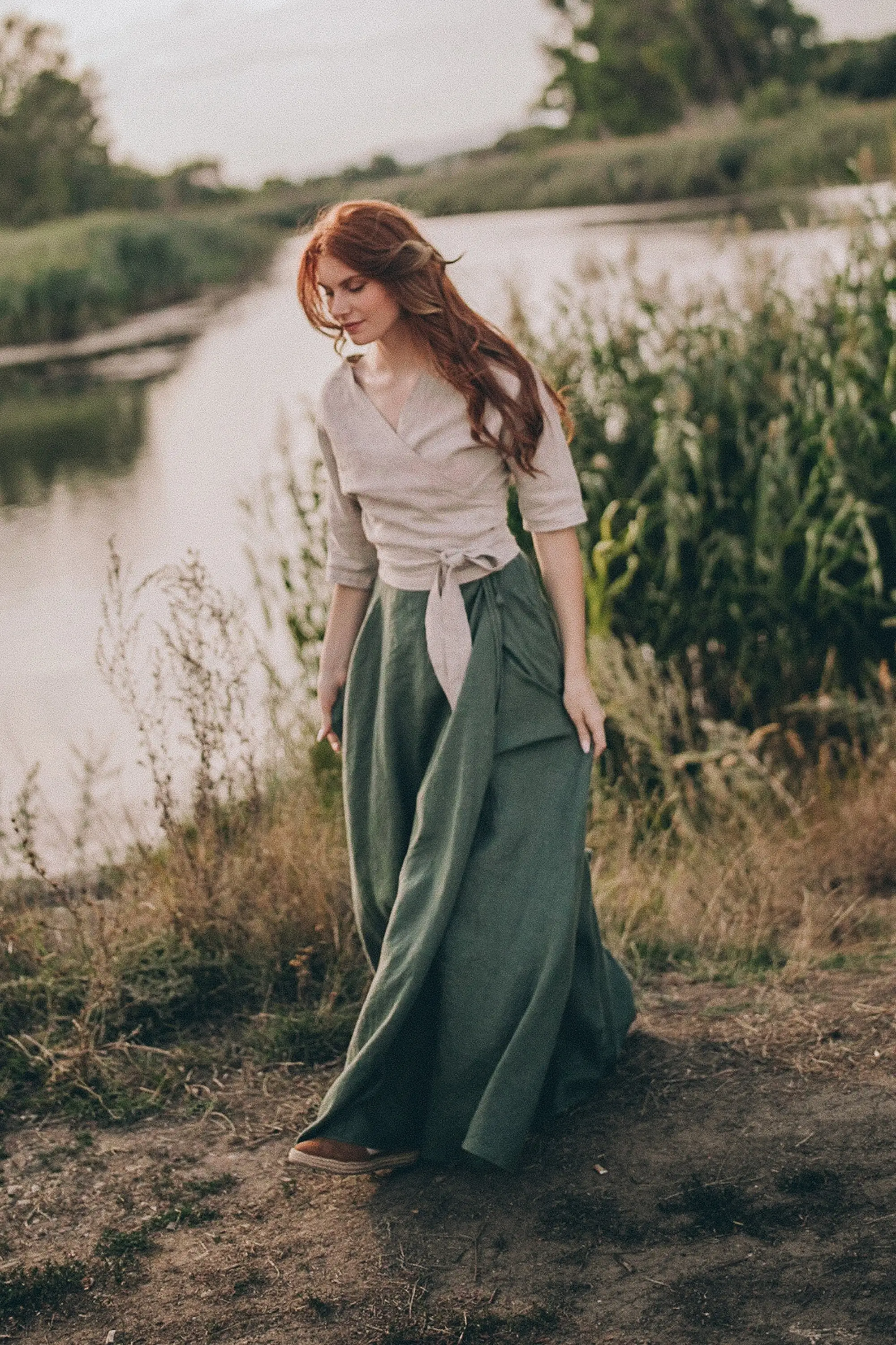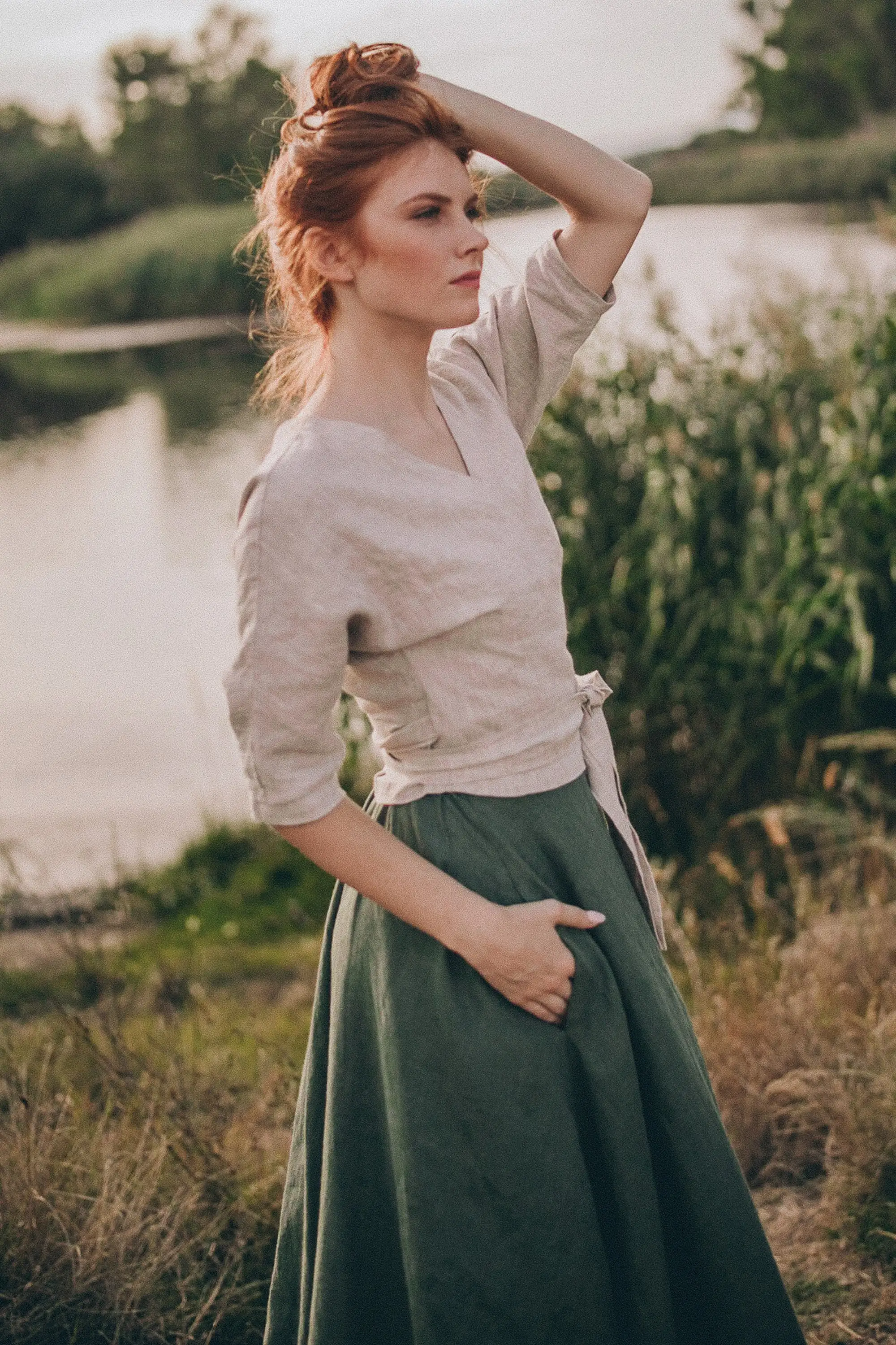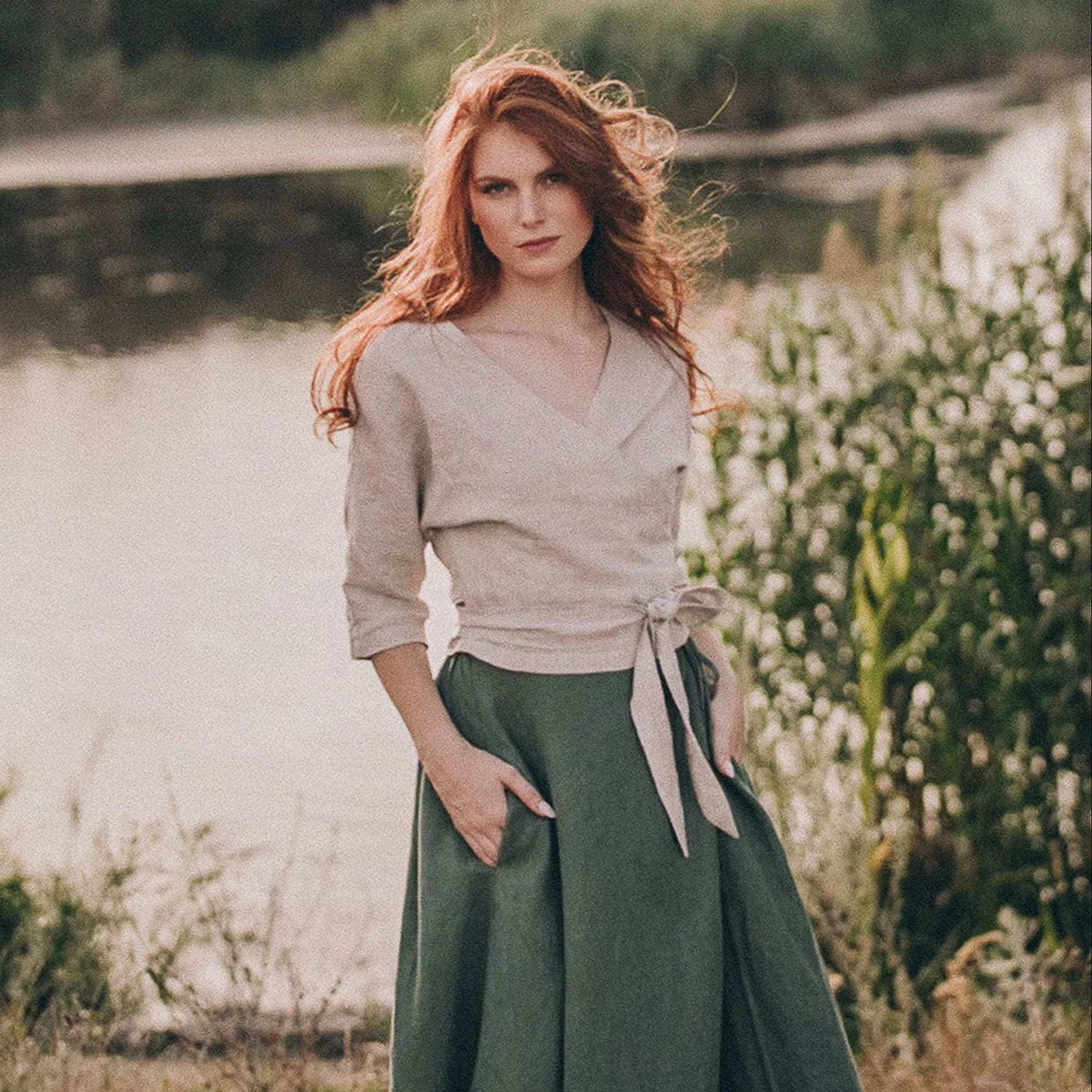 Classic Reversible Linen Appliques Top Wrap Blouse Cropped Vintage Shirt Tie Waist Long Sleeves Natural Plus Size Eco-Friendly