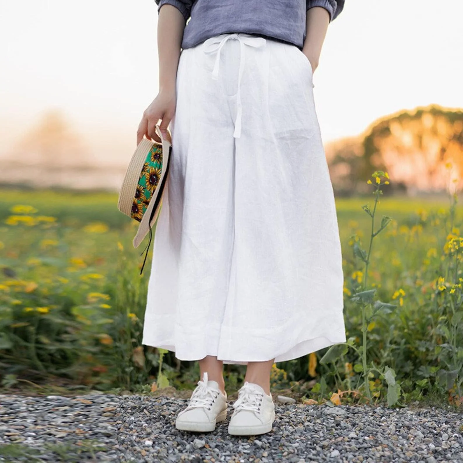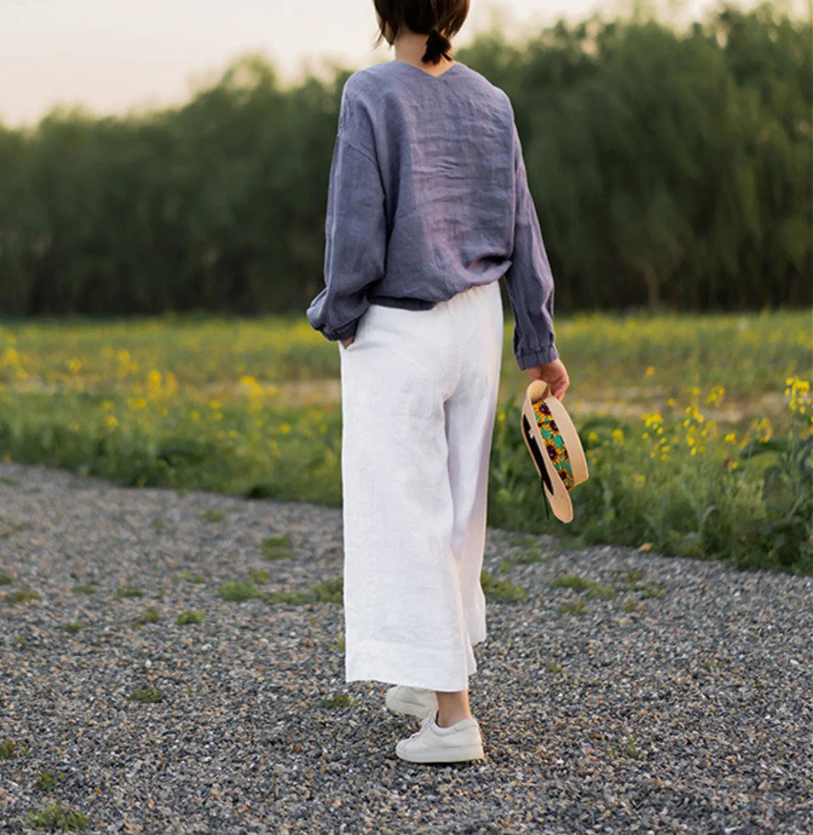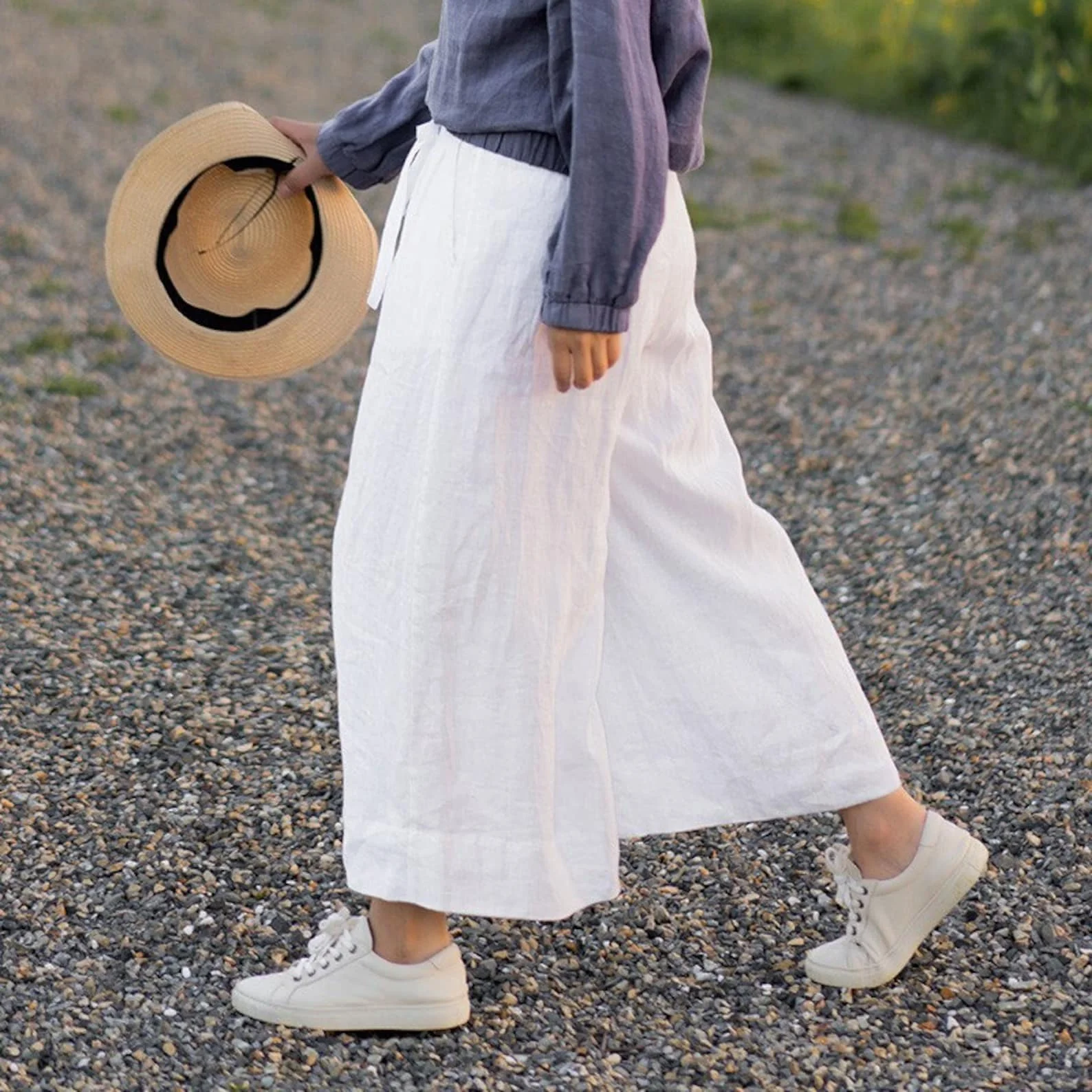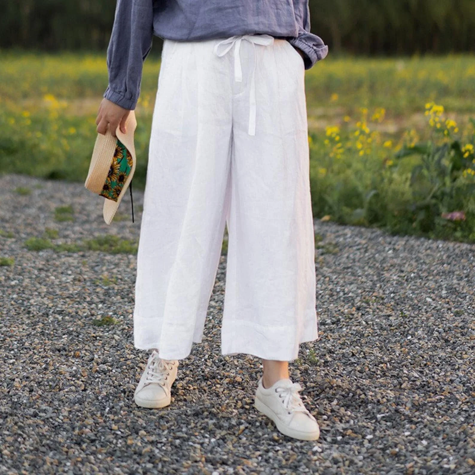 Handmade Custom High-Waisted Summer Pants Women Linen Woven Wide Leg Eco-Friendly Breathable Button Geometric Pattern Regular