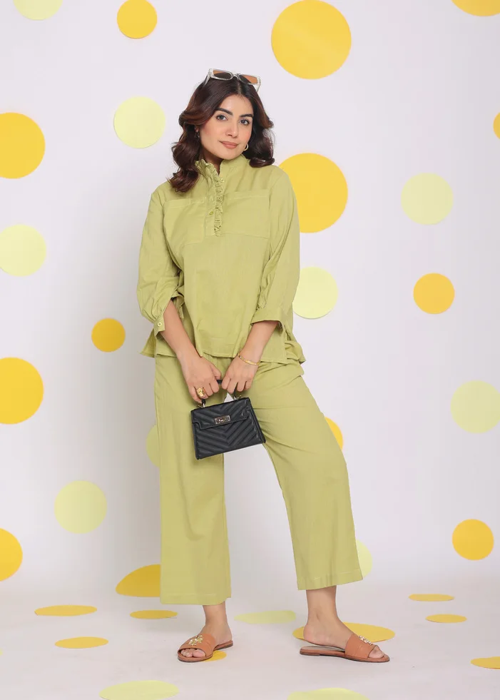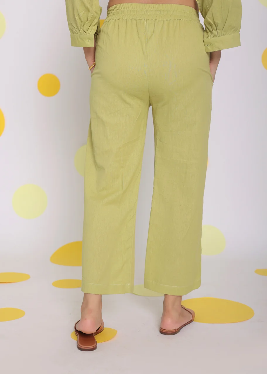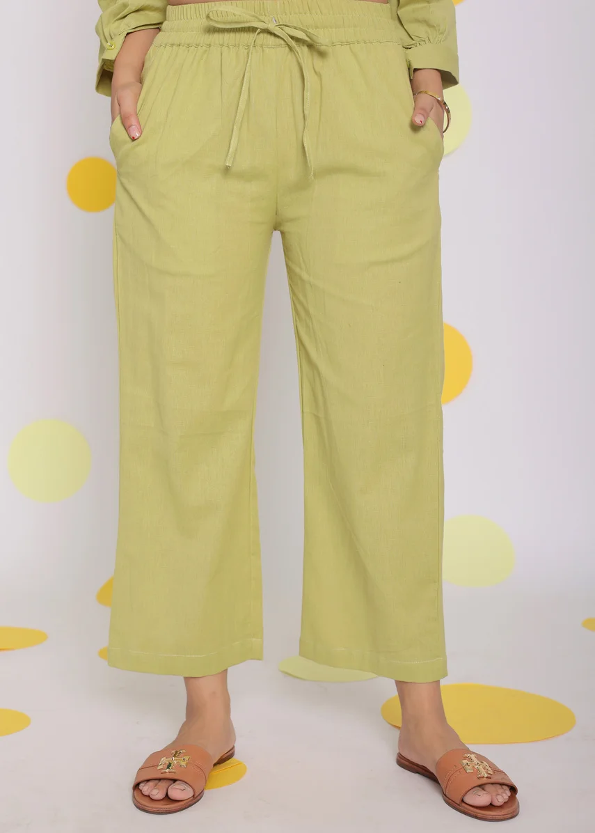 Light Green Linen Solid Plain Dyed Western Pant Natural Waist Tie Belt Pockets Relaxed A-Line Casual Dress Set Digital Printing