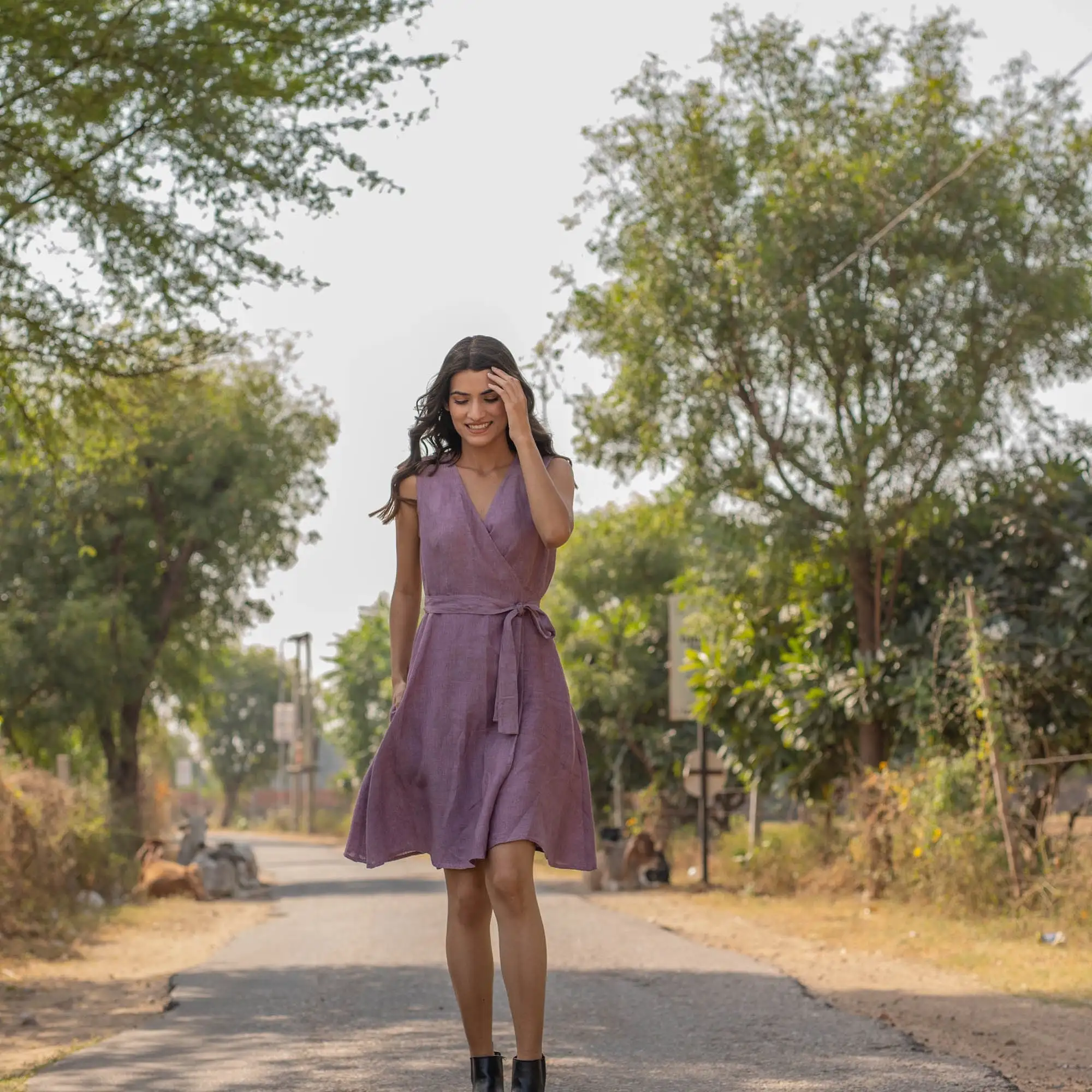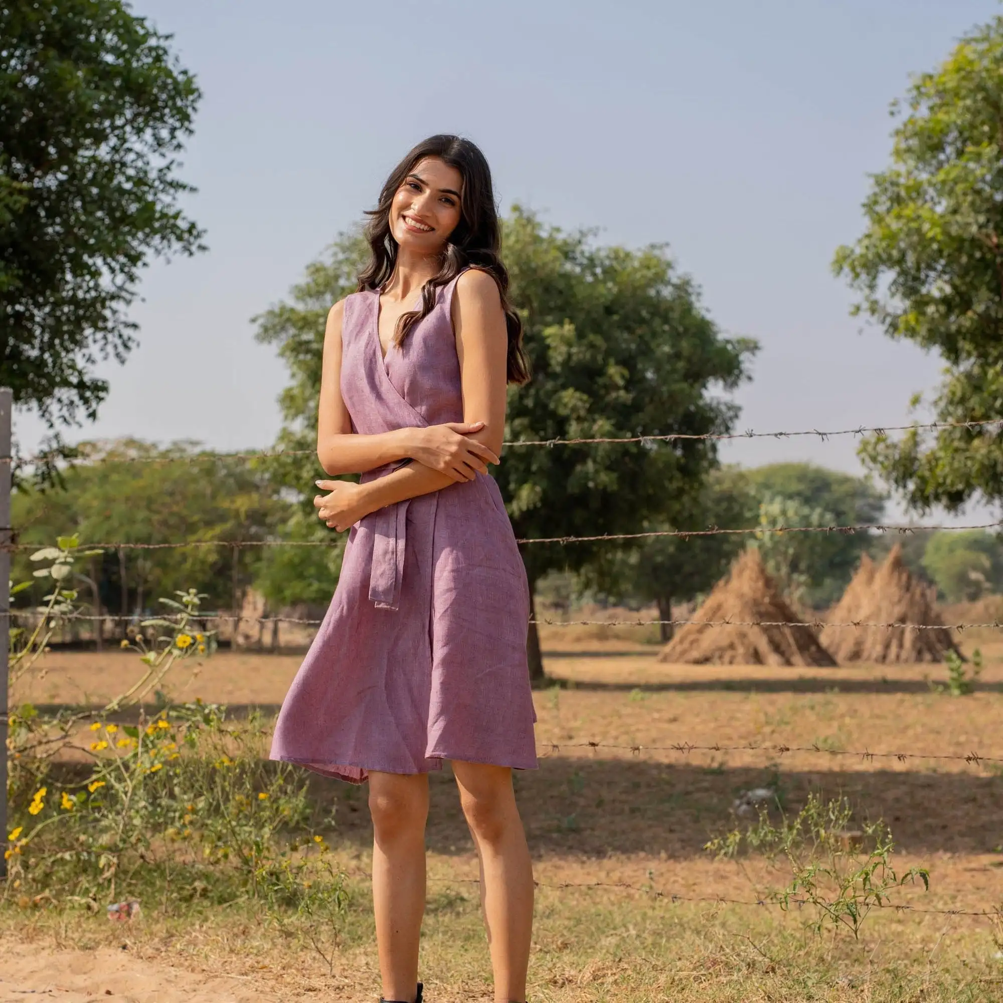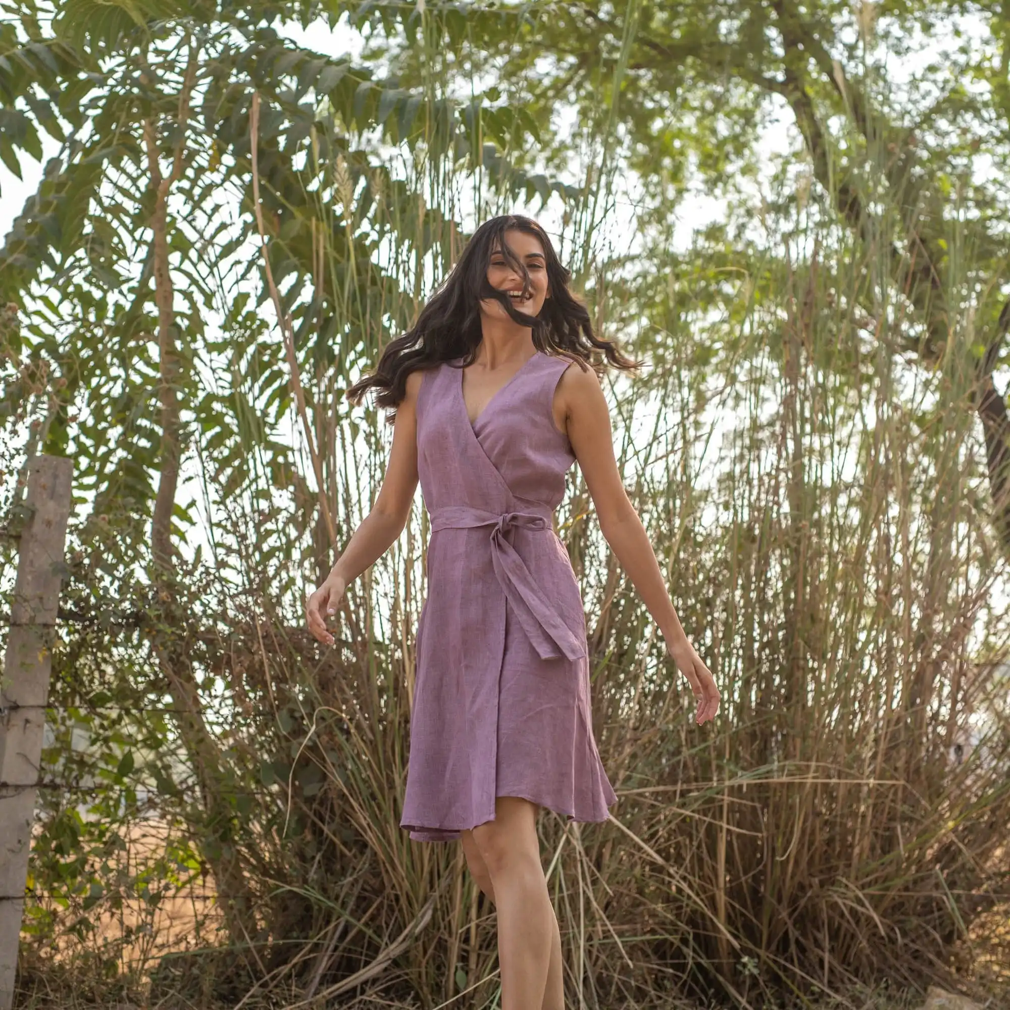 Sleeveless Midi Kimono Dress Eco-Friendly Linen Wrap Tunic Pockets Casual Knee Length Hourglass Shape Comfortable Belt Natural