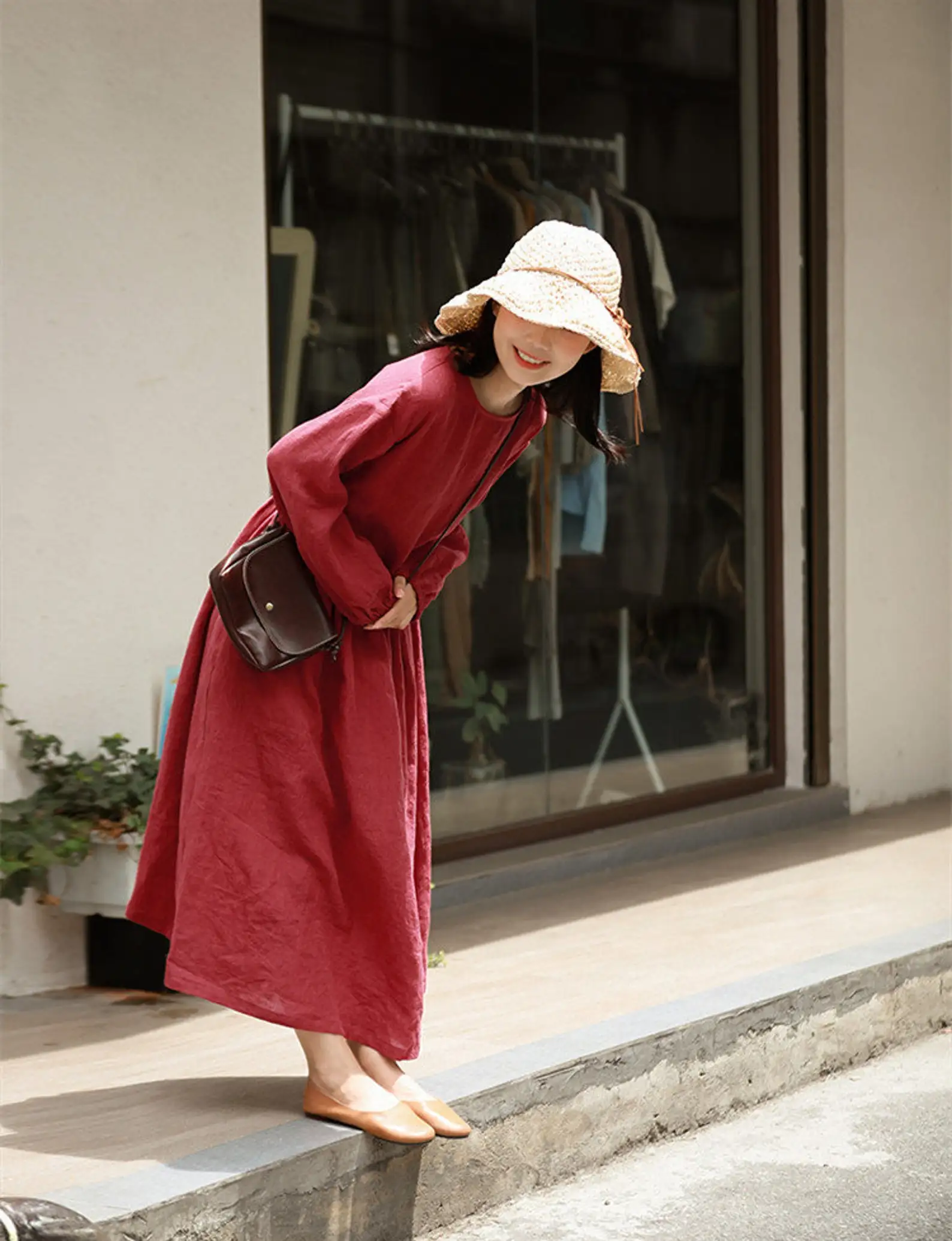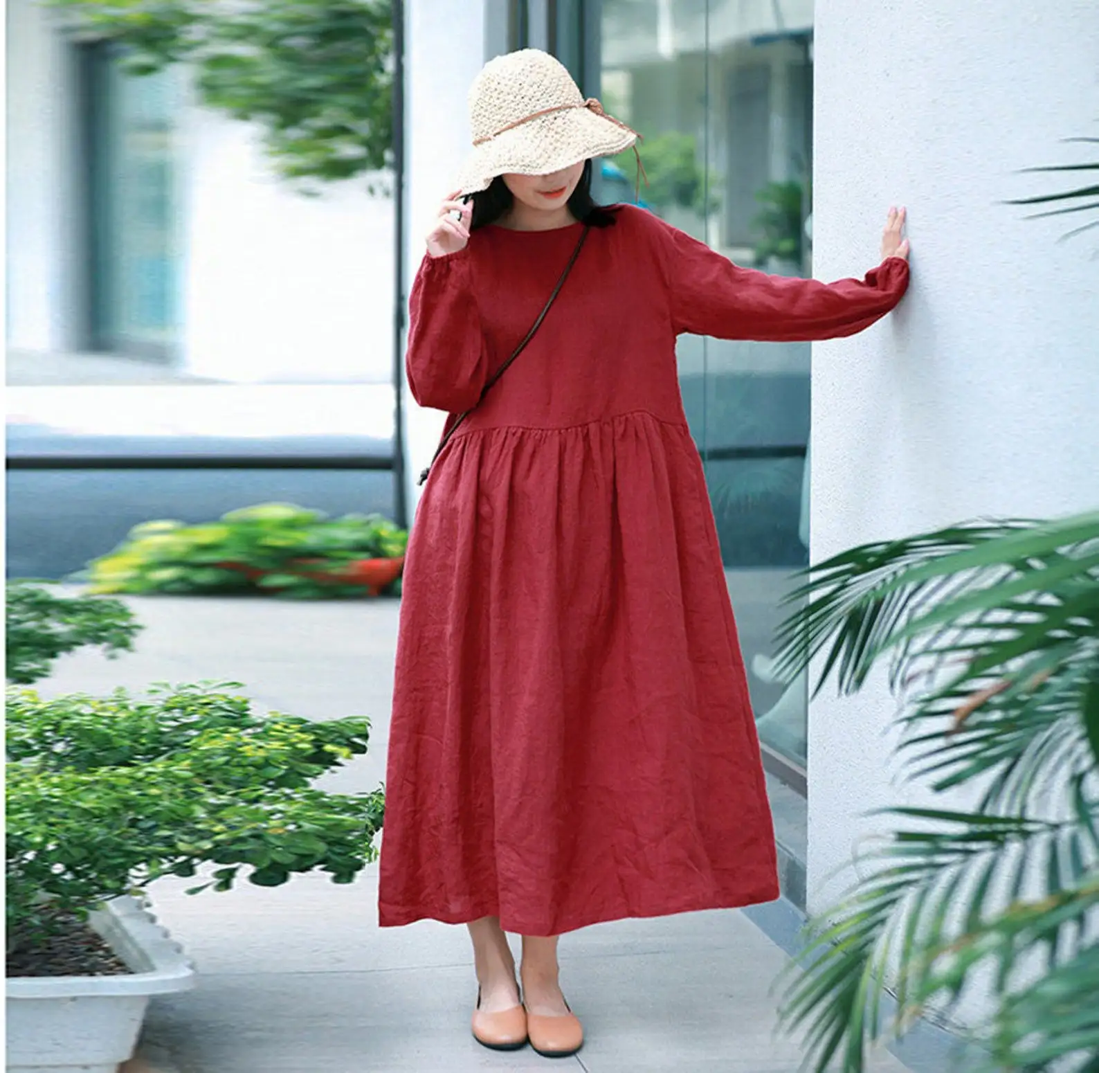 Women's Linen Woven Tunic Dress Long Sleeves Custom Midi Dress Summer Regular Fit High Quality Big Sizes Natural Waistline