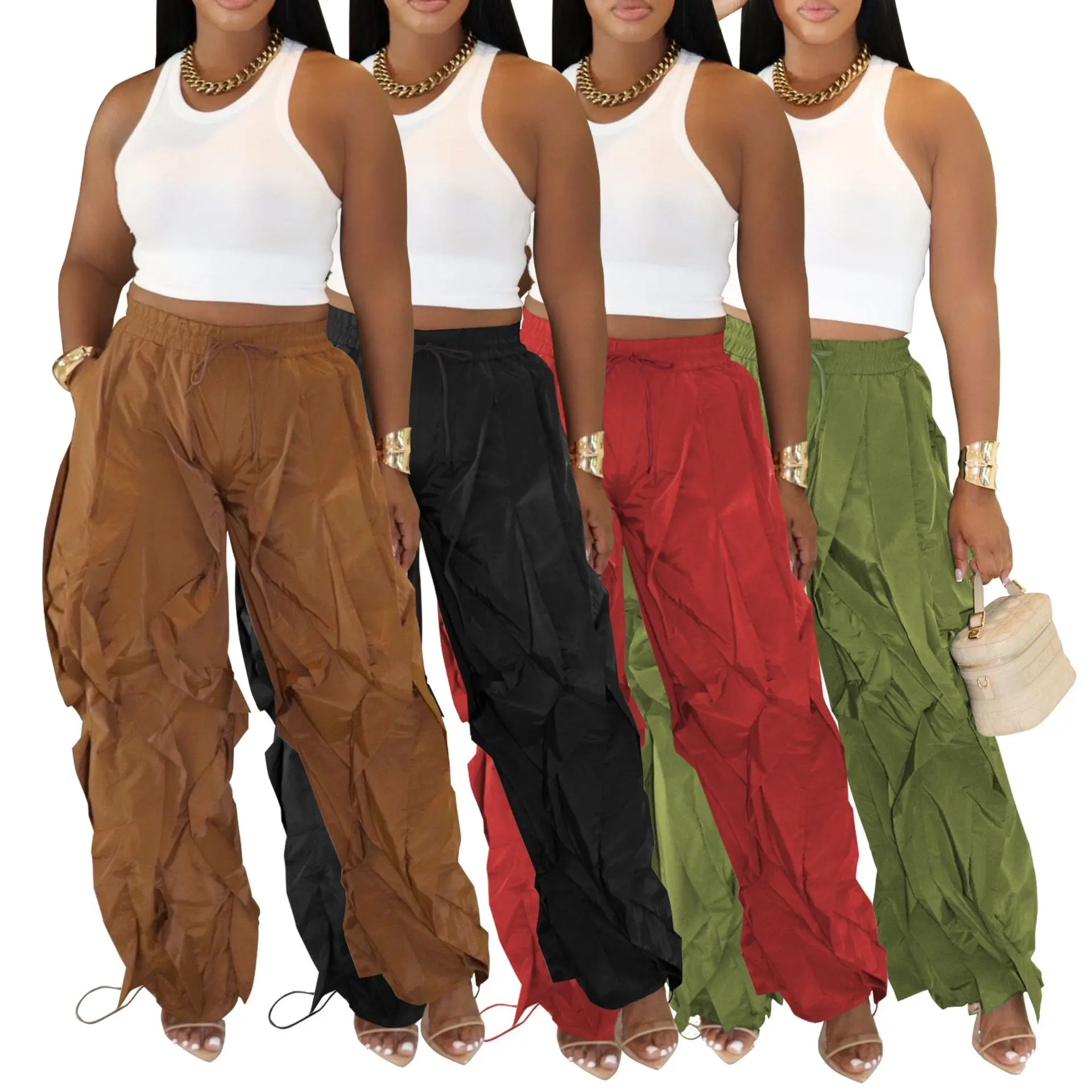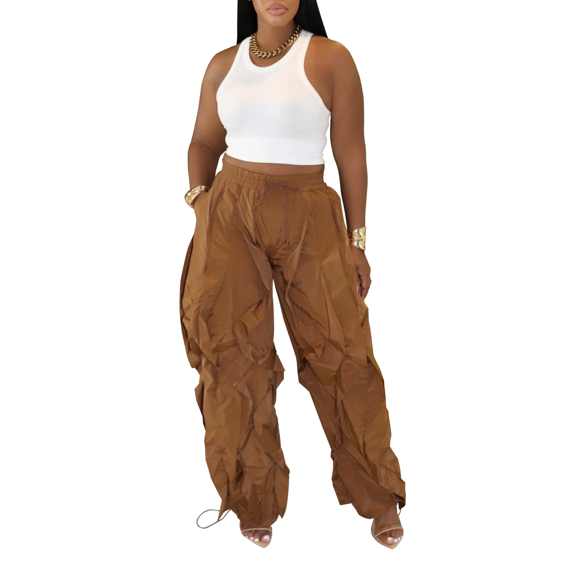 2026 New Arrival Women's Casual Elastic Waist Ruched Details Harem Trousers Wide Leg Loose Pants Baggy Lantern Slacks Pants