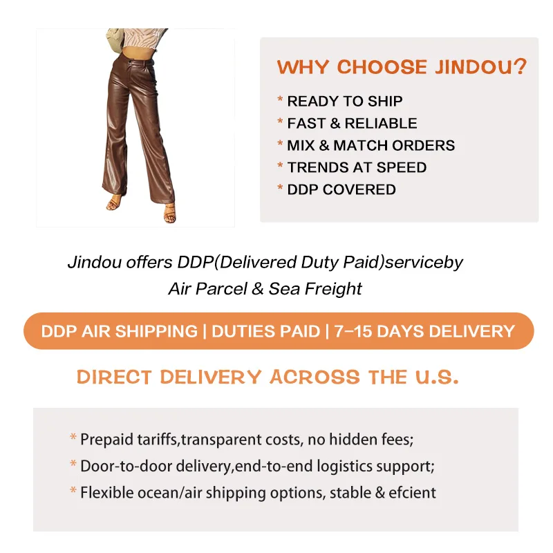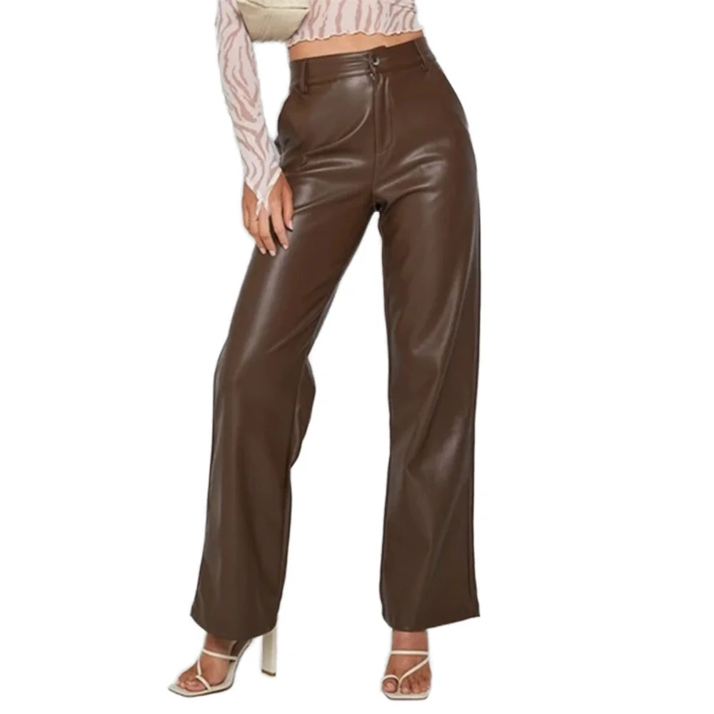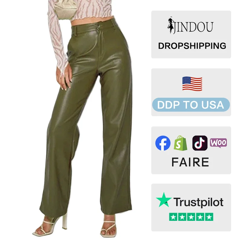 Autumn Casual Fashion Regular Fit High Waist PU Breathable Dark Plain Dyed Elastic Waist High Street Straight Pants