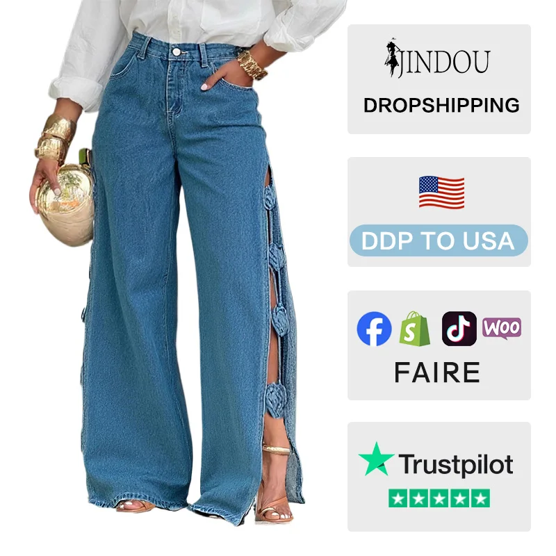 New Style Women's Sexy Jeans Hollow-Out Split-Leg 3D Floral Design Breathable Denim Mid-Waist Loose Fit Casual Summer Winter