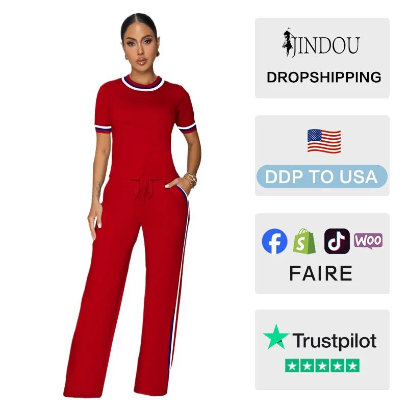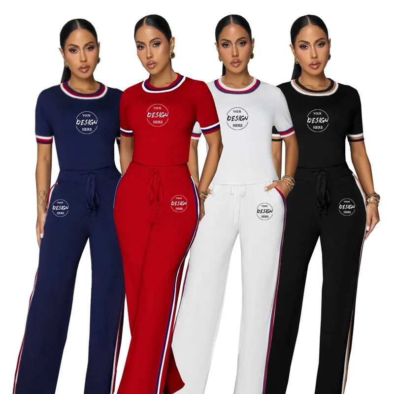 2026 Custom Logo Summer Women's Side Stripe Stitching Thread Color Contrast Loose Set Short Top Solid Pattern Sports Two-Piece
