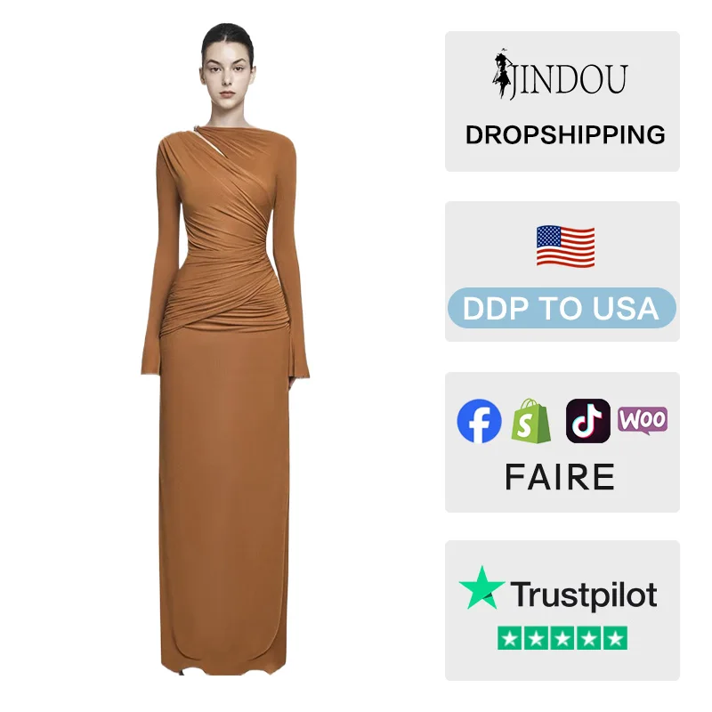 ZYHT 73849 European Wholesale Fashion Casual One Shoulder Ruched Maxi Dress Side Slit Pleated Long Sleeve Dresses for Women