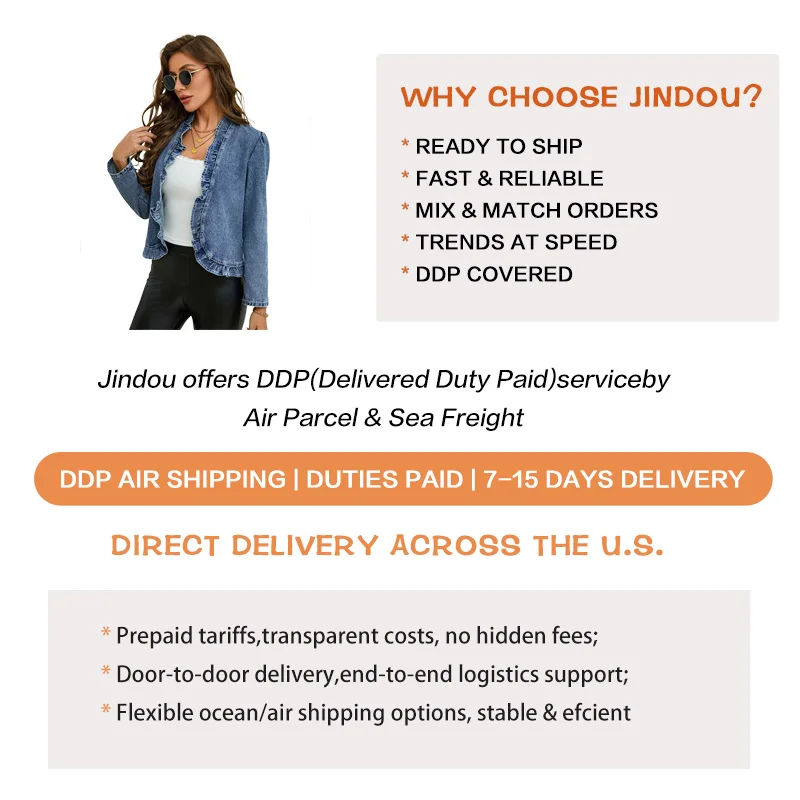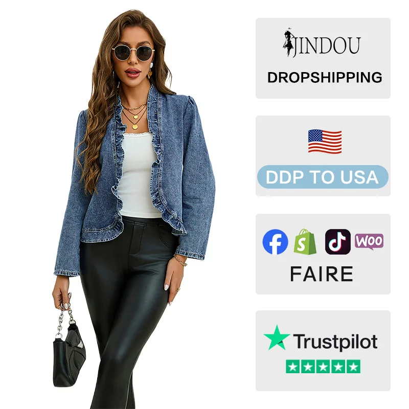 2026 Spring Summer Solid Washed Knitted Work Office Women's Open Front Ruffle Trim Long Sleeve Denim Cardigan Jacket