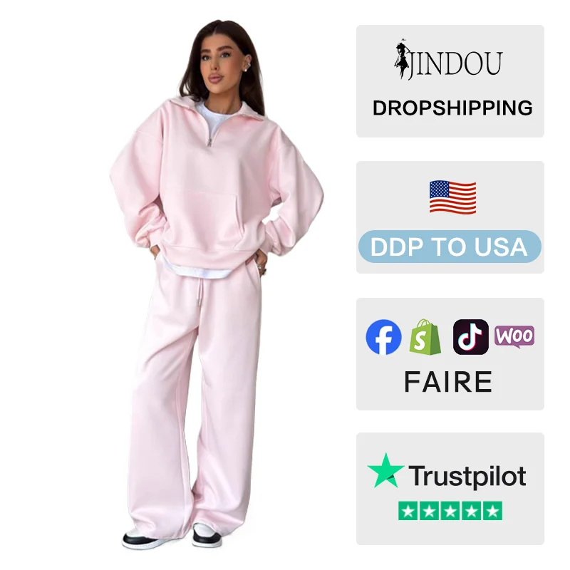 Logo Customized Casual Women's Cotton Polyester Suit Zipper Lapel Pullover Sweat and Loose Wide-leg Pants Jogger Set