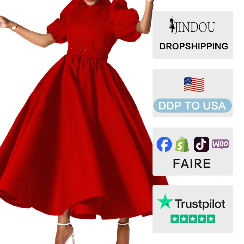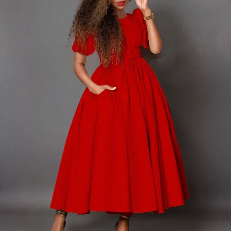 Hot Sale Women Fashion Clothing Solid Color Elegant Office Dresses Casual Loose Wrap Waist Slim A-line Plus Size Dress