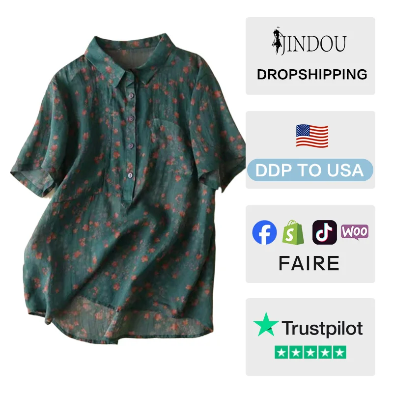 2026 Summer Women New Style Bohemian Stand-Collar Floral Short-Sleeve Top Ladies Elegant Petite Ramie Artistic Shirt