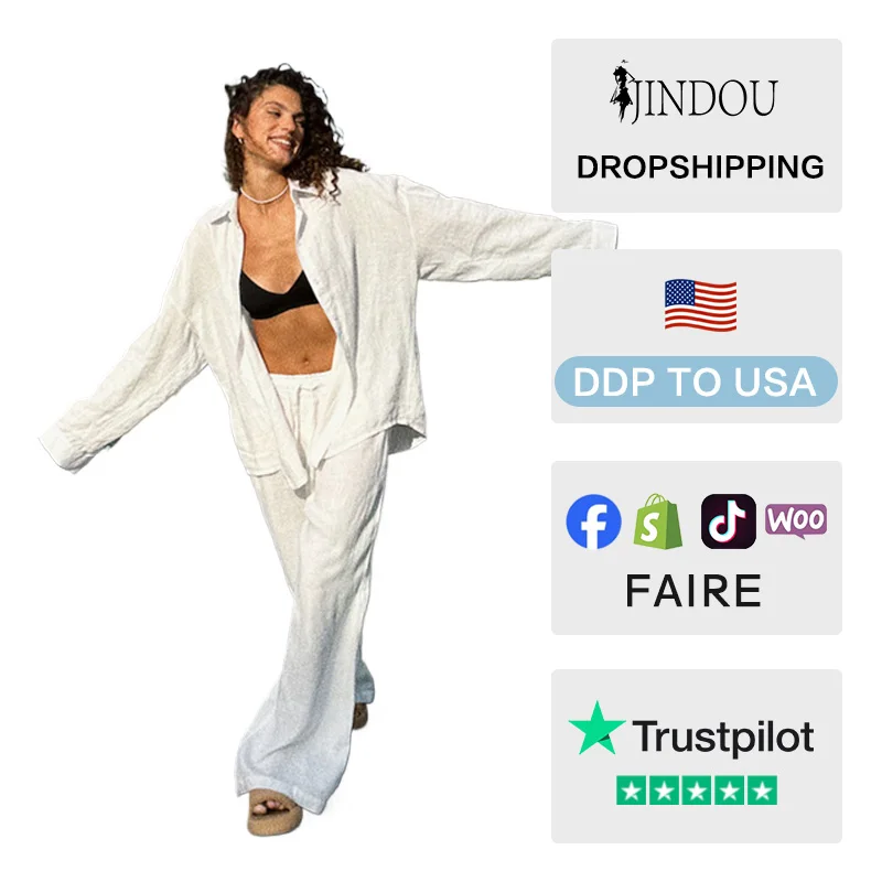 Custom Logo Women Solid Cotton Casual Shirt Pants Suit 2026 Spring Summer Loose Long Sleeve Full Length 2 Piece Set