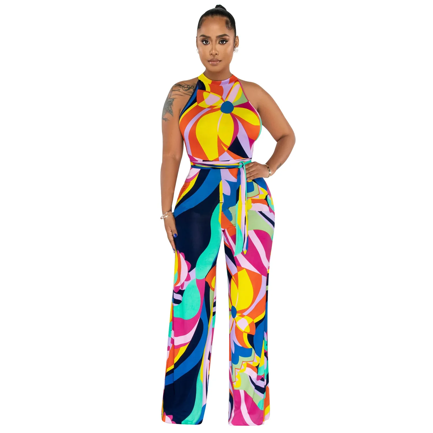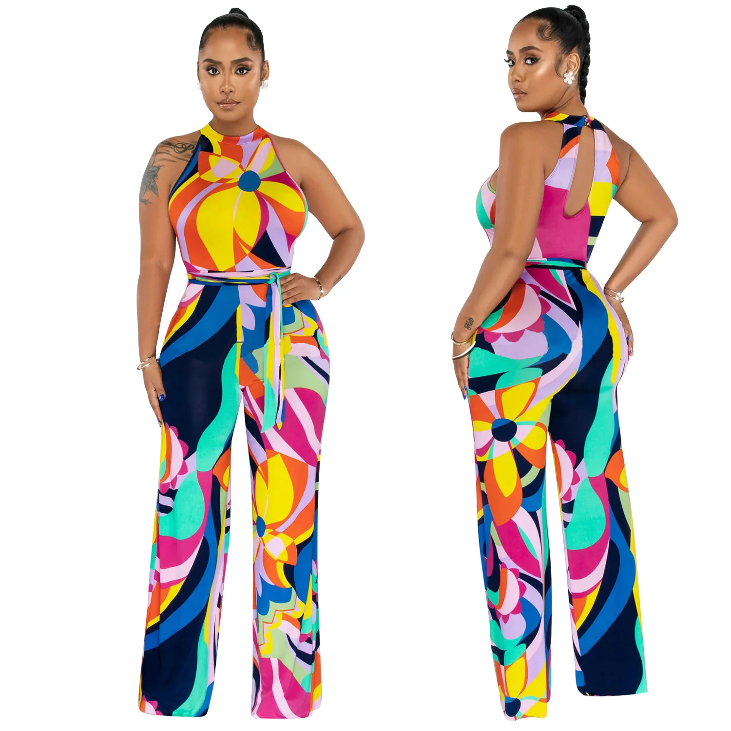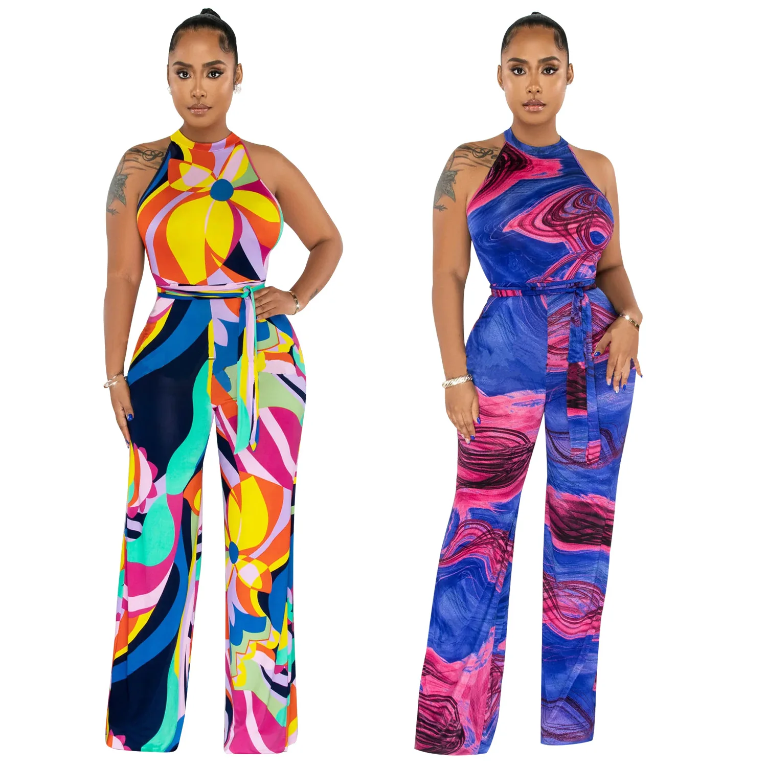 2025 New Arrival Women Sexy Halter Sleeveless Print Straight Leg Jumpsuit Ladies One Piece Jumpsuits