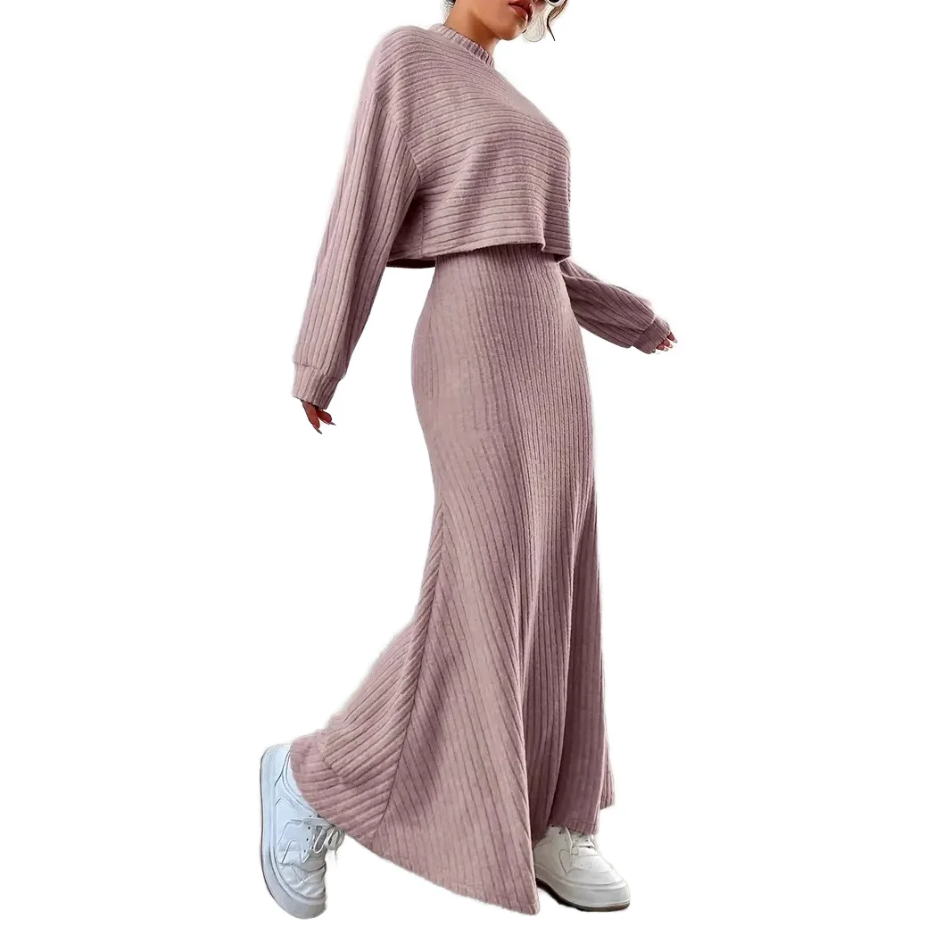ZYHT 21541 Wholesale Crew Neck High Waist Casual Dresses Elegant Lace Velvet Mermaid Hem Ruched Long Sleeve Dresses for Women