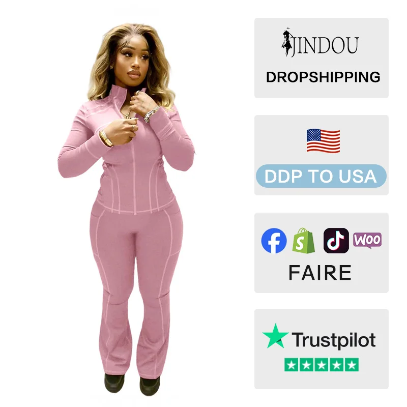 Custom Logo Women's Casual Sport Stretch Two Pieces Set Solid Color Long Sleeve Jacket Shirt Leggings and Flare Pants Set