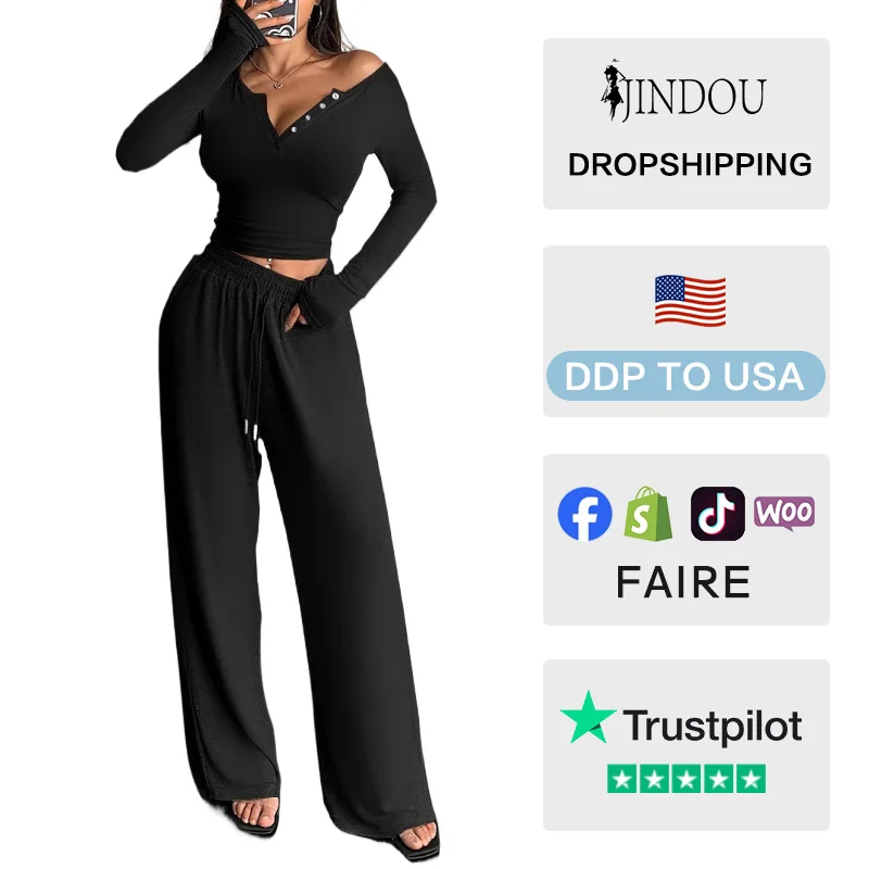 Women Solid Casual Two Piece Pajama Set Sexy V-neck Long Sleeve Top Loose High Waist Wide Leg Pants Sleepwear Spandex/Polyester