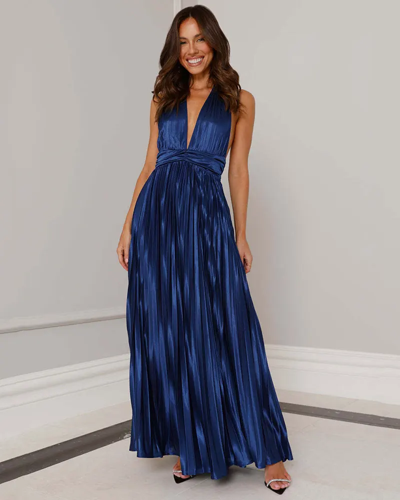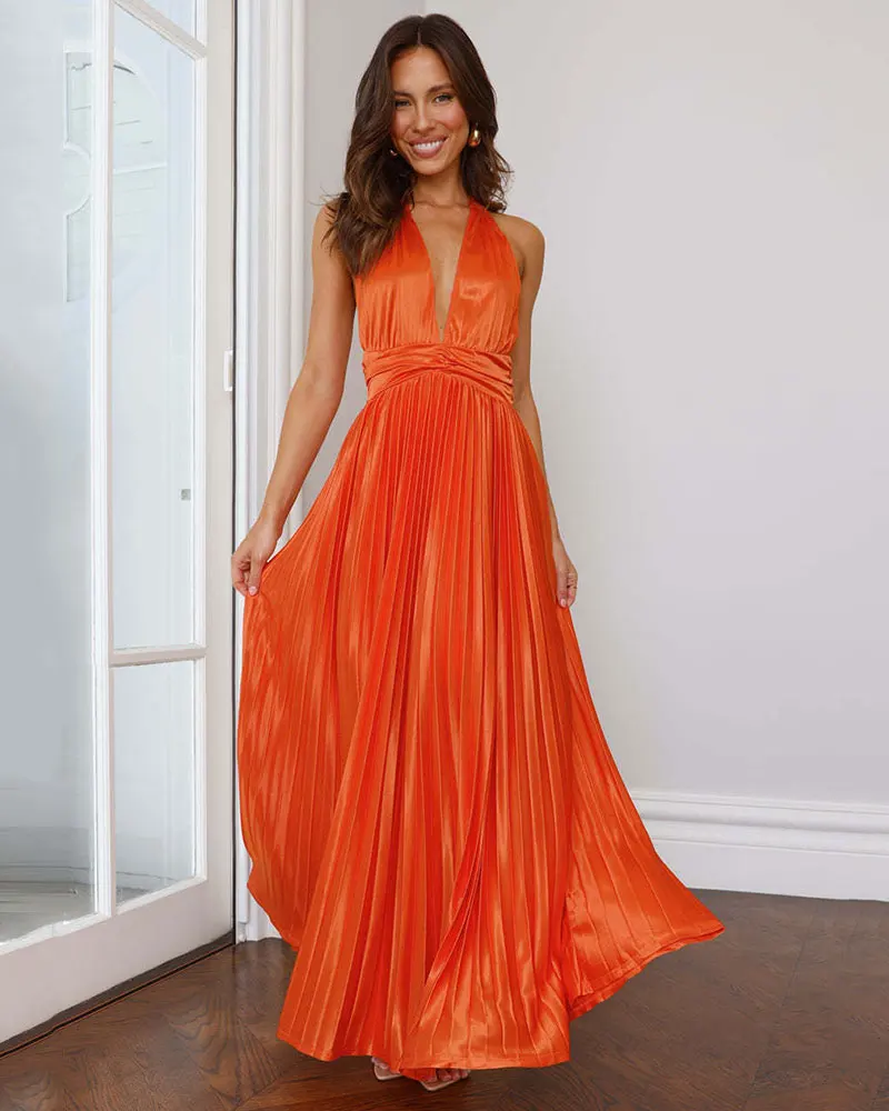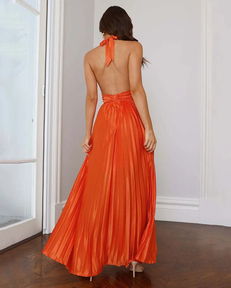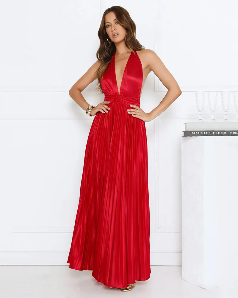 Halter Sexy Backless Ruched Maxi Dress Elegant Sleeveless Slim Fashion Ladies Club Party Long Pleated Dresses