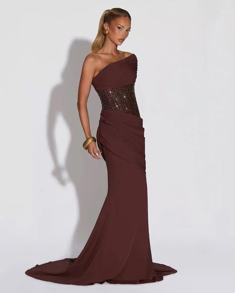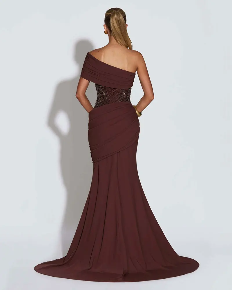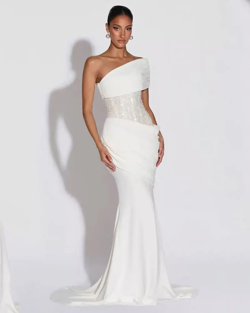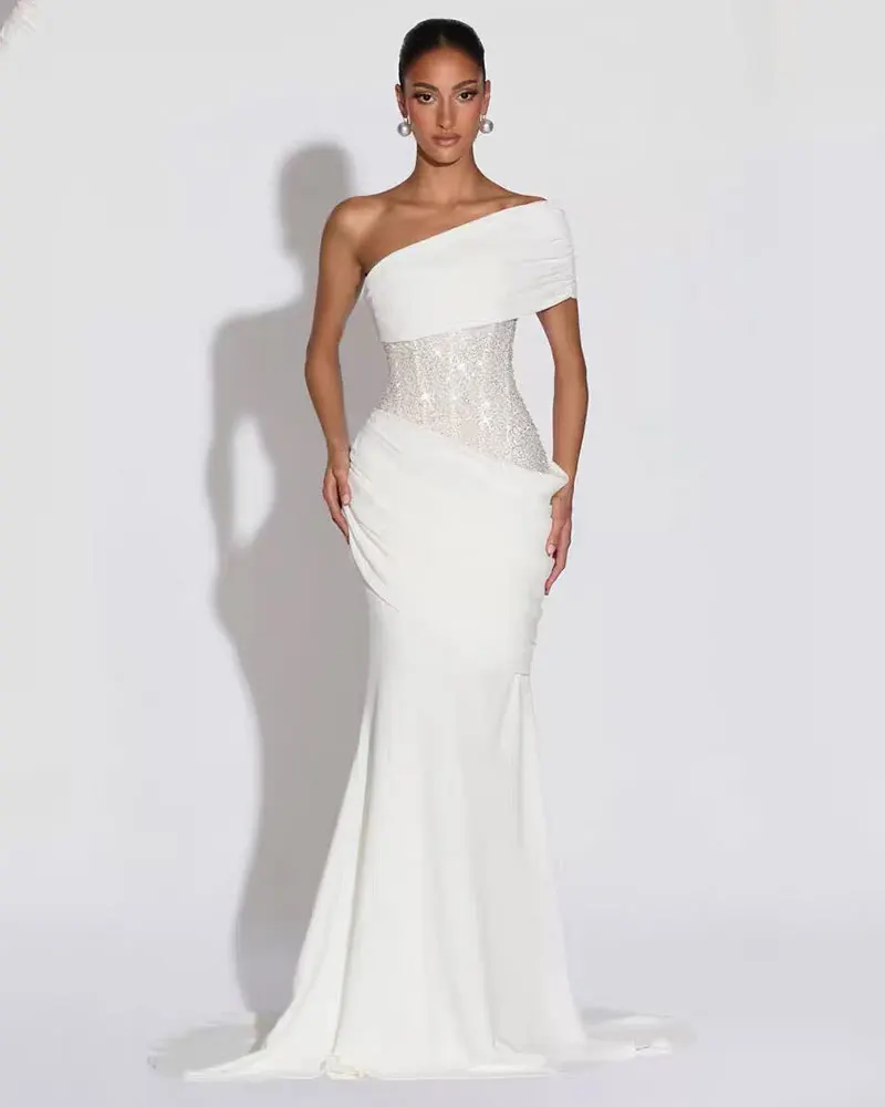 ZYHT 73903 Gemstone Crystal 3D Flower Decoration Ruched One Shoulder High Slit Long Sleeve Maxi Simple Elegant Evening Dress