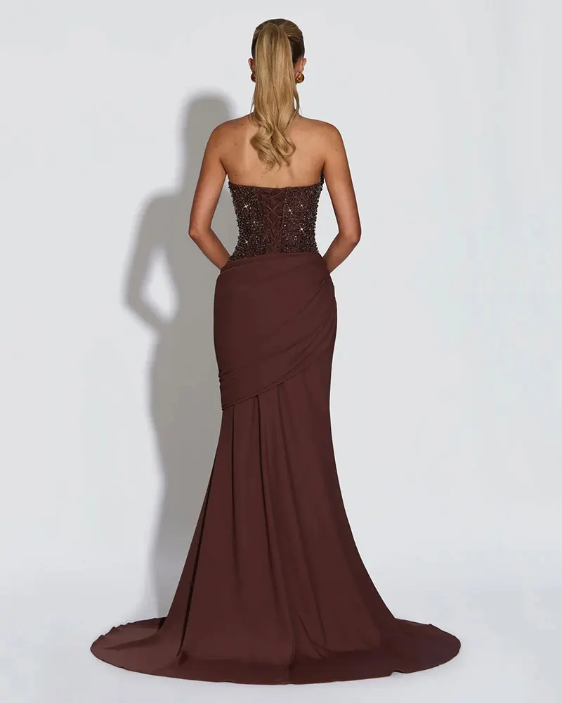 ZYHT 73957 Hot Selling Women Lady Printed Satin Beige Mermaid Fish Tail Floor Length Party Cocktail Evening Dress Gown