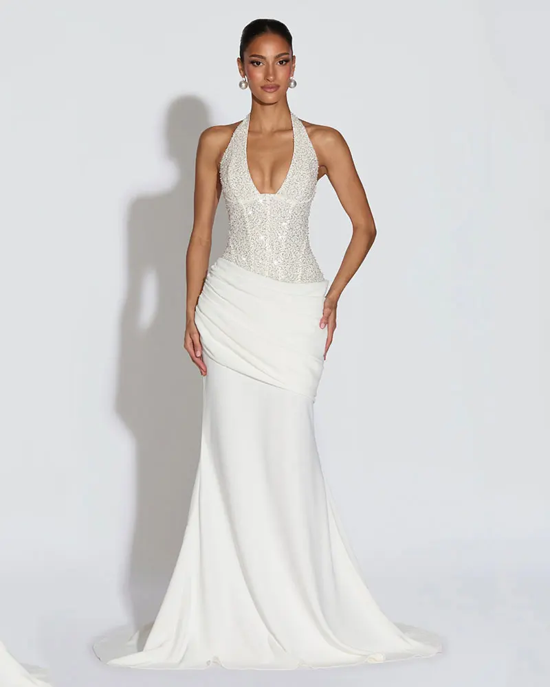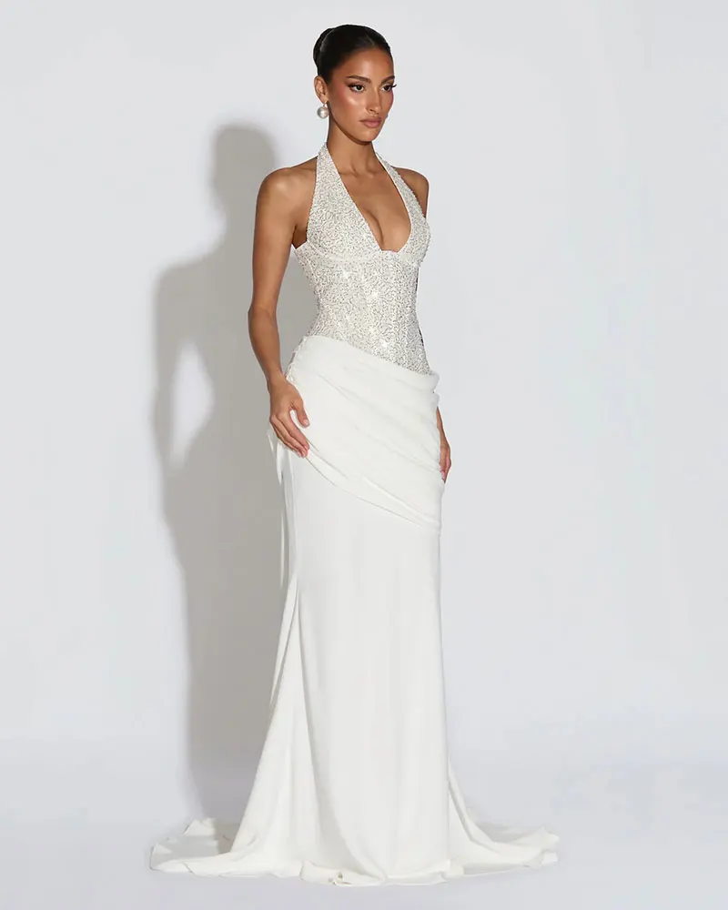 Customized Sequins Halter Back Lace-up Sexy Maxi Dress Women Gown Elegant Patchwork Sleeveless Bodycon Club Party Long Dress