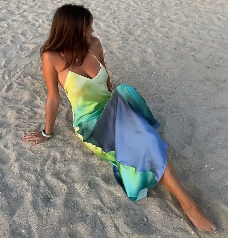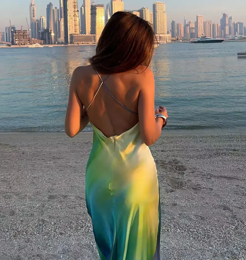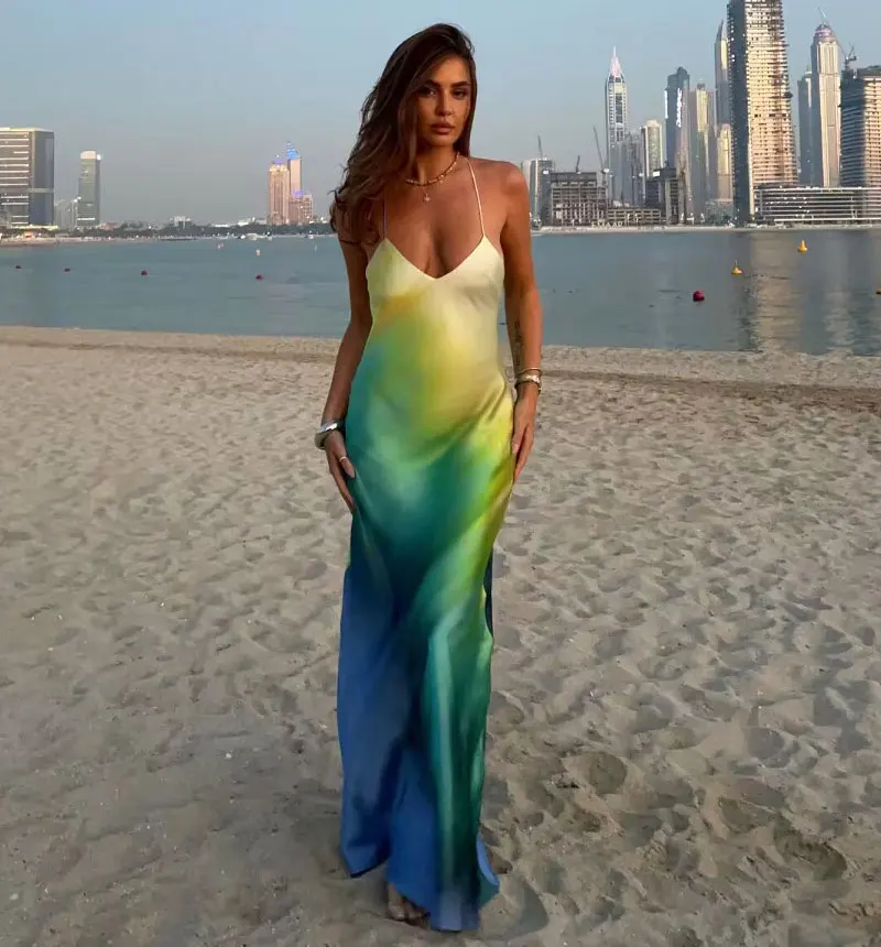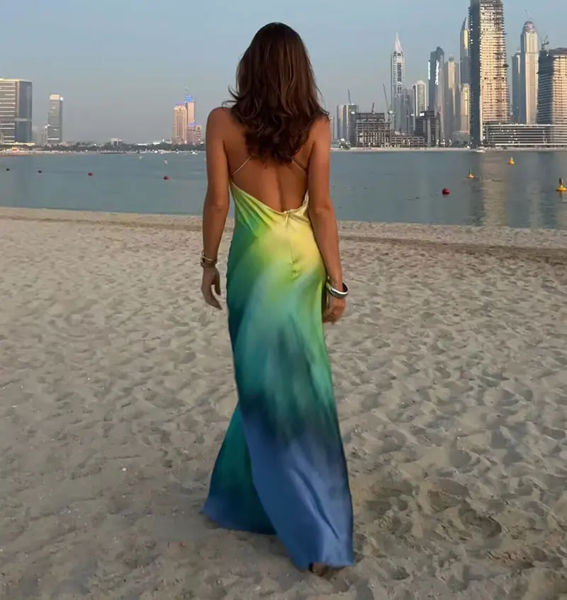 Satin Print Sexy Maxi Bodycon Beach Dress Summer Holiday Women Dye Tie Backless Elegant Party Dresses