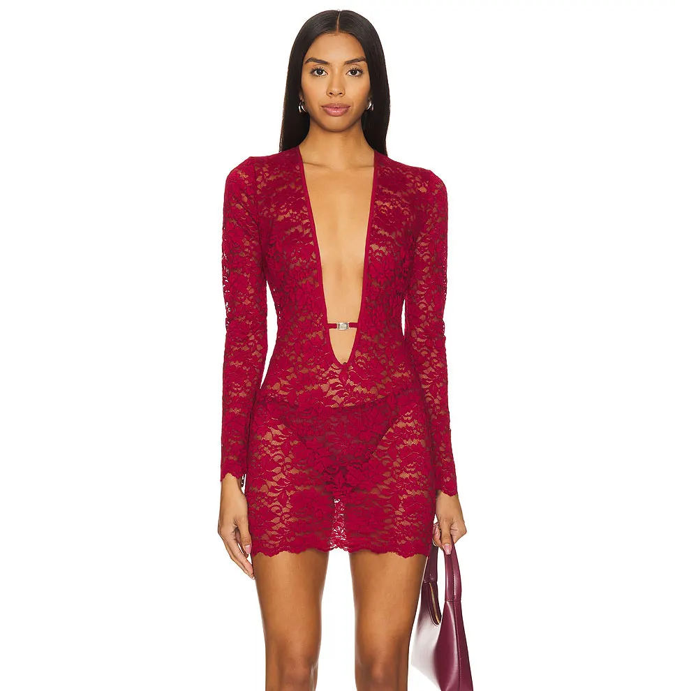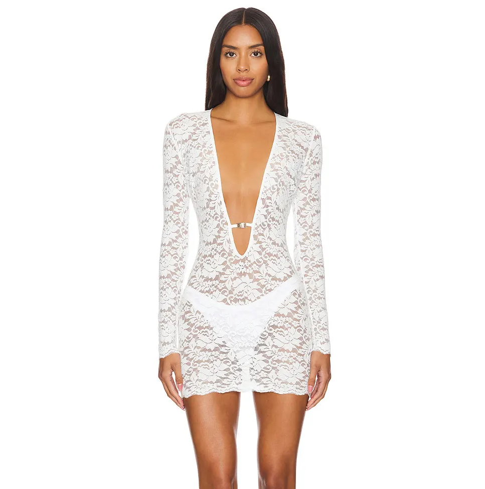 Custom Sexy Lace See Through Slim Fit Long Sleeve Mini Dress New Women's Dress