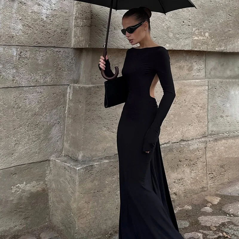 Sexy Backless Bodycon Maxi Dress New Autumn Slim Women's Clothing Elegant Gown Pleated Club Party Long Dresses