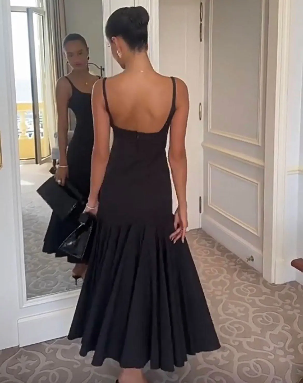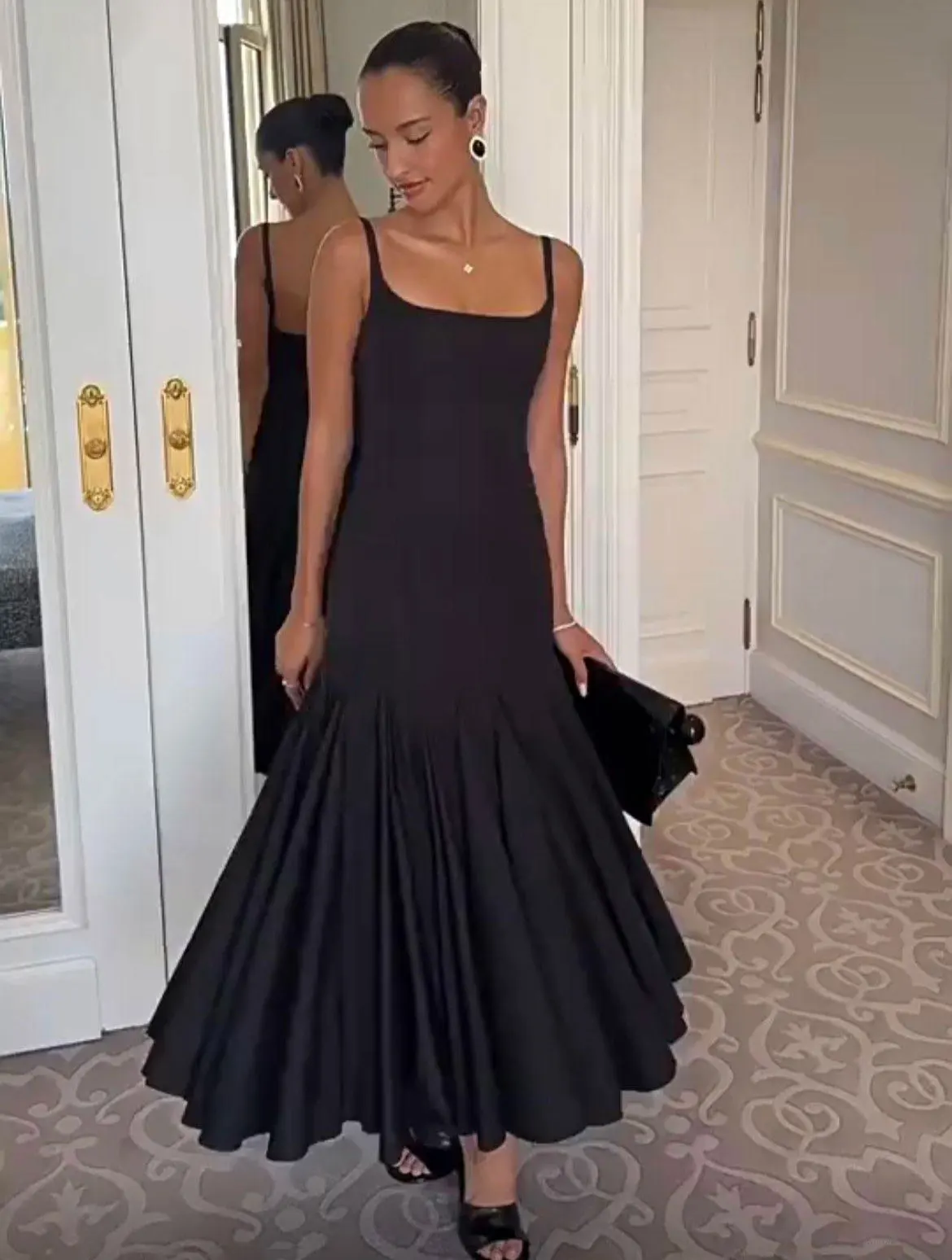 Spaghetti Strap Backless Sexy Maxi Dress Women Black Off-shoulder Sleeveless High Waist Pleated Club Party Long Dresses
