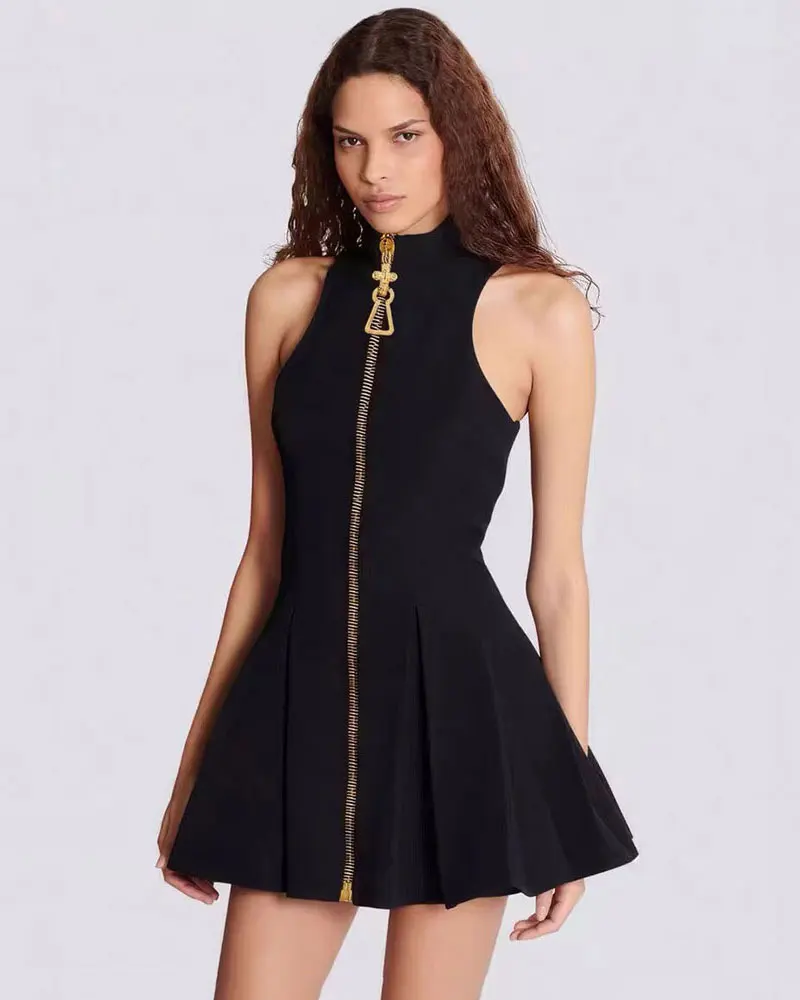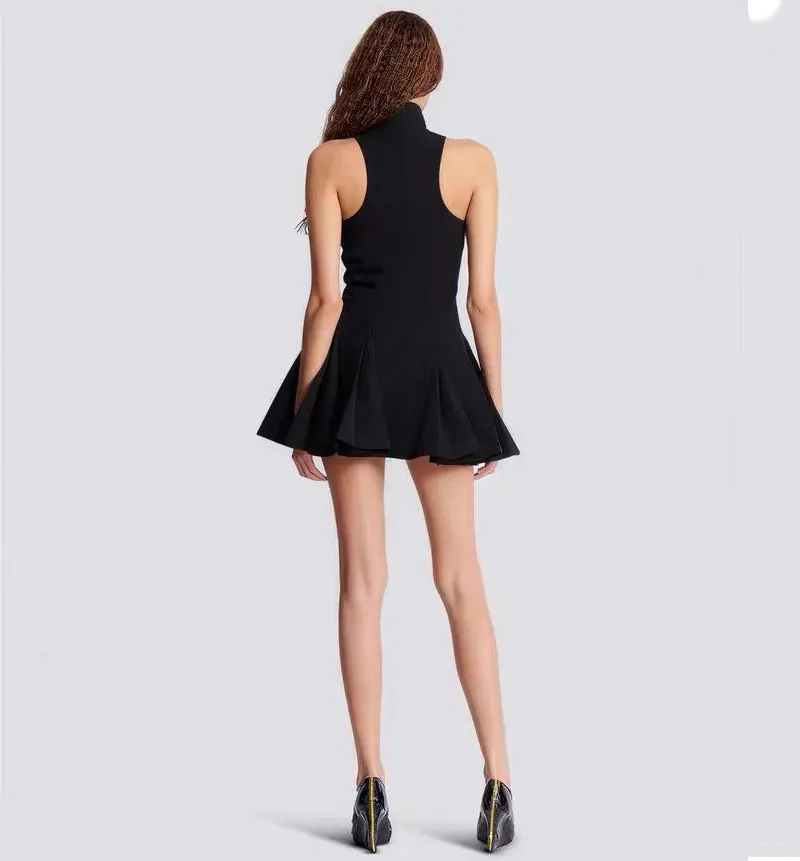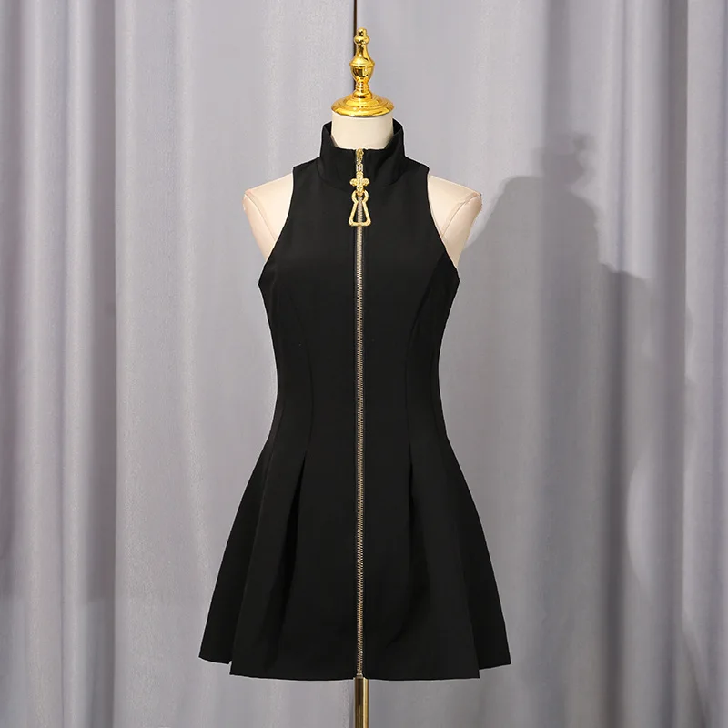 Sexy Mini A-line Dress Women Gown Elegant Black Sleeveless Zipper Ruched Slim Club Party Evening Dress