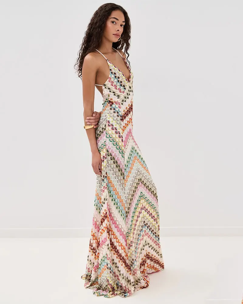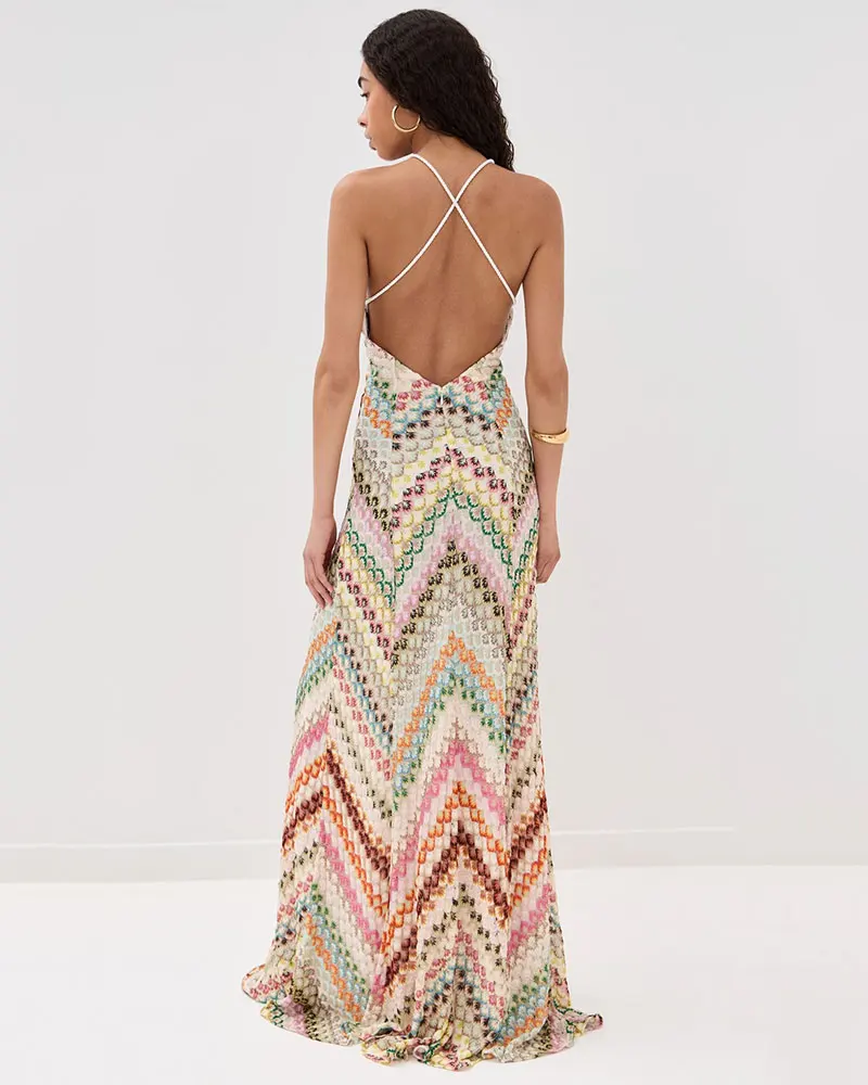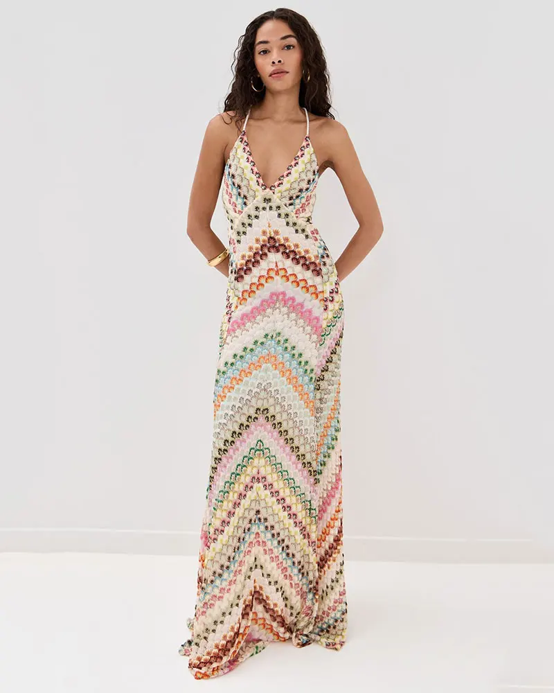 Sexy Crochet V Neck Halter Maxi Dress Women New Summer Fashion Sleeveless Backless Slim Knitted Long Dress