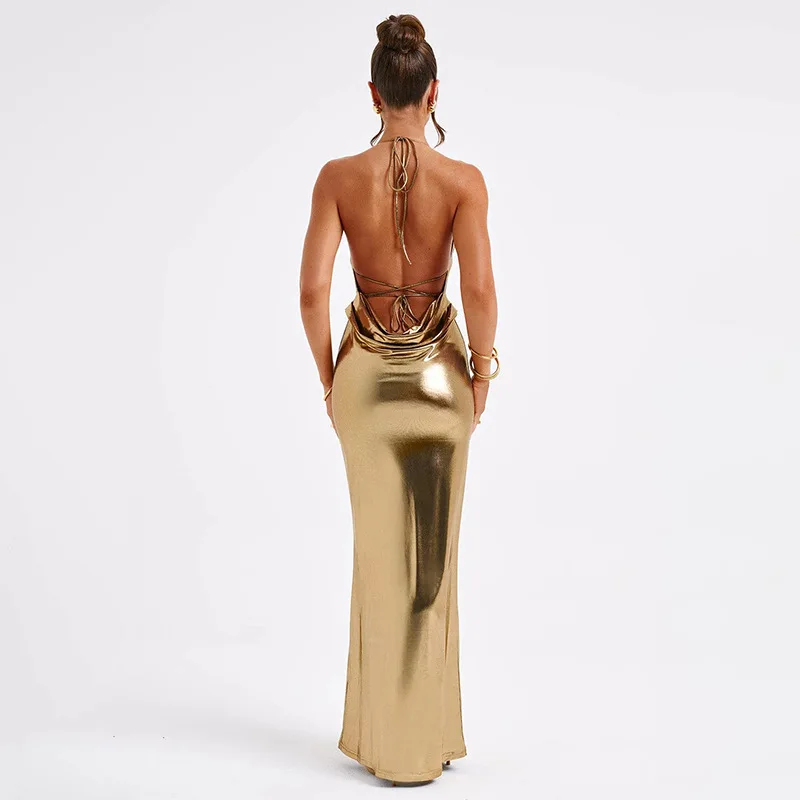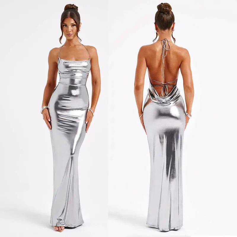 Sexy Sleeveless Metal Maxi Dress for Women Elegant Backless Lace-up Bodycon Club Party Evening Long Dress