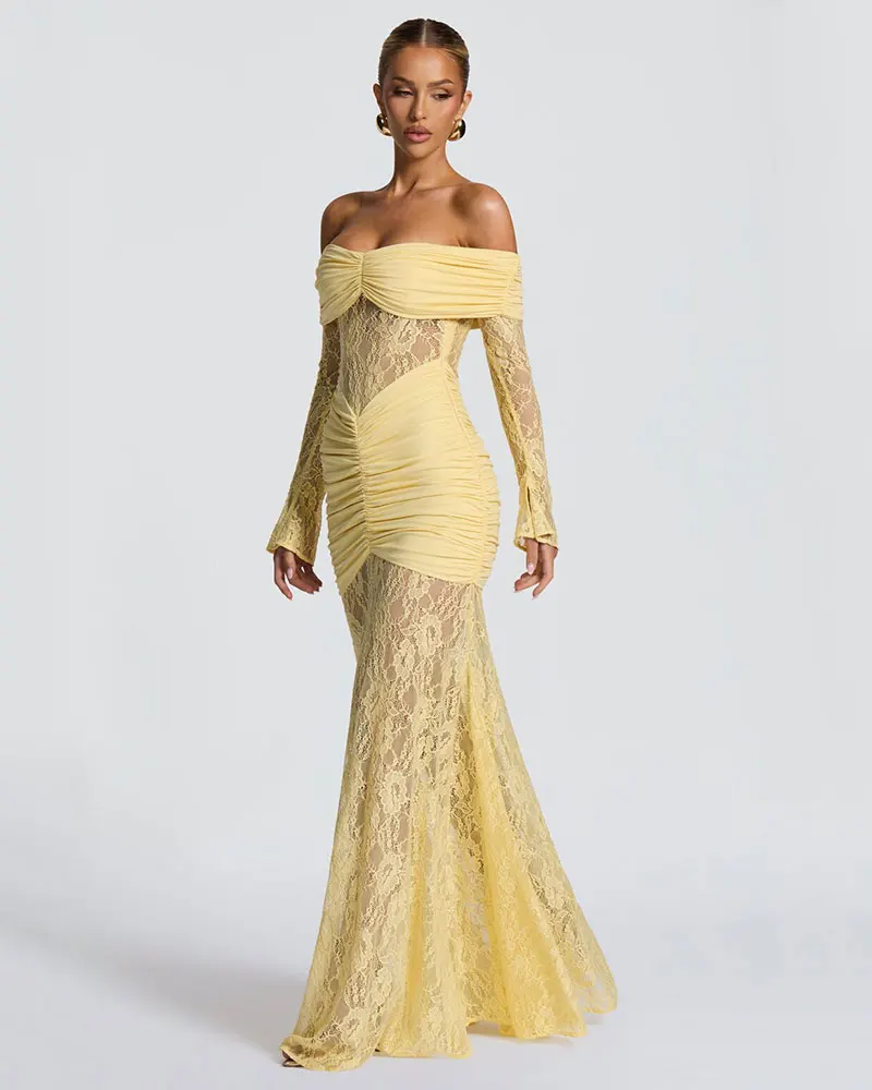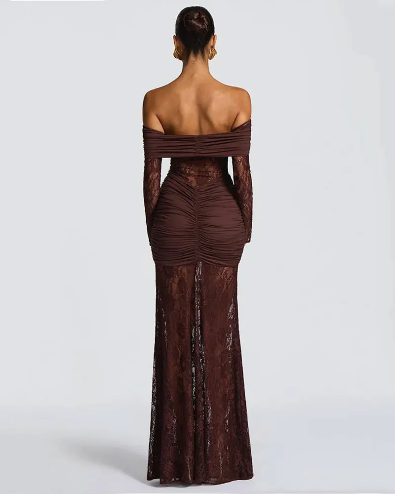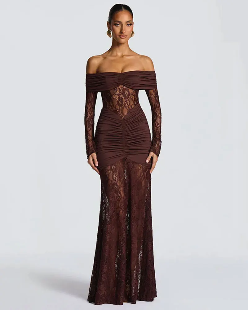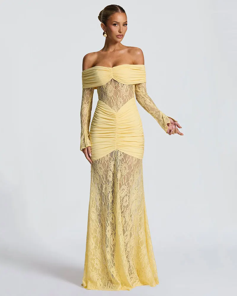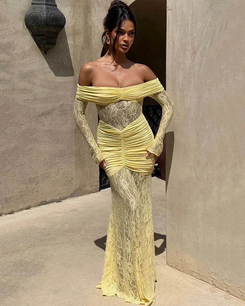 Elegant Mesh Lace Patchwork Bodycon Maxi Dress for Women Summer Sexy Off-Shoulder Sheer Party Club Evening Long Dress