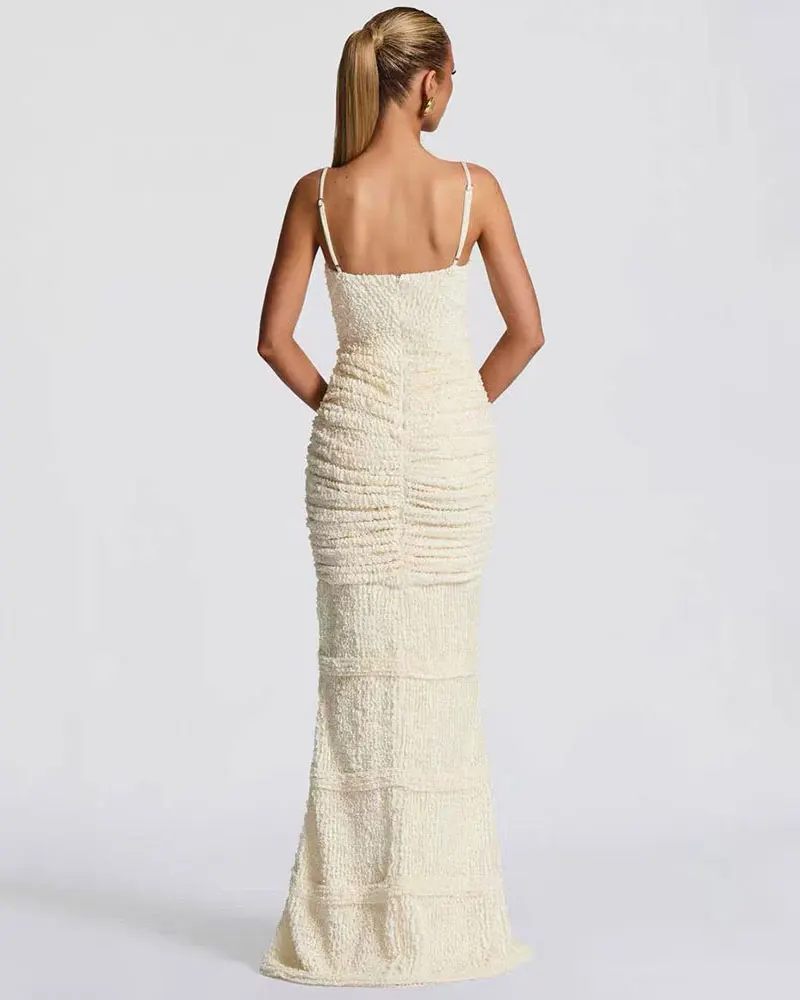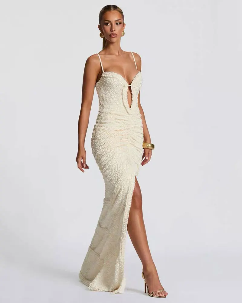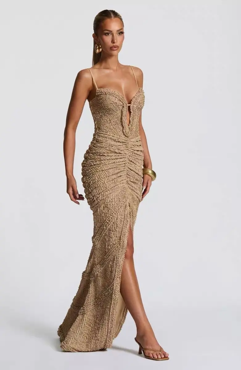 Sexy Split Pleated Maxi Dress Women Summer INS Fashion Sleeveless Elegant Bodycon Club Party Long Dress