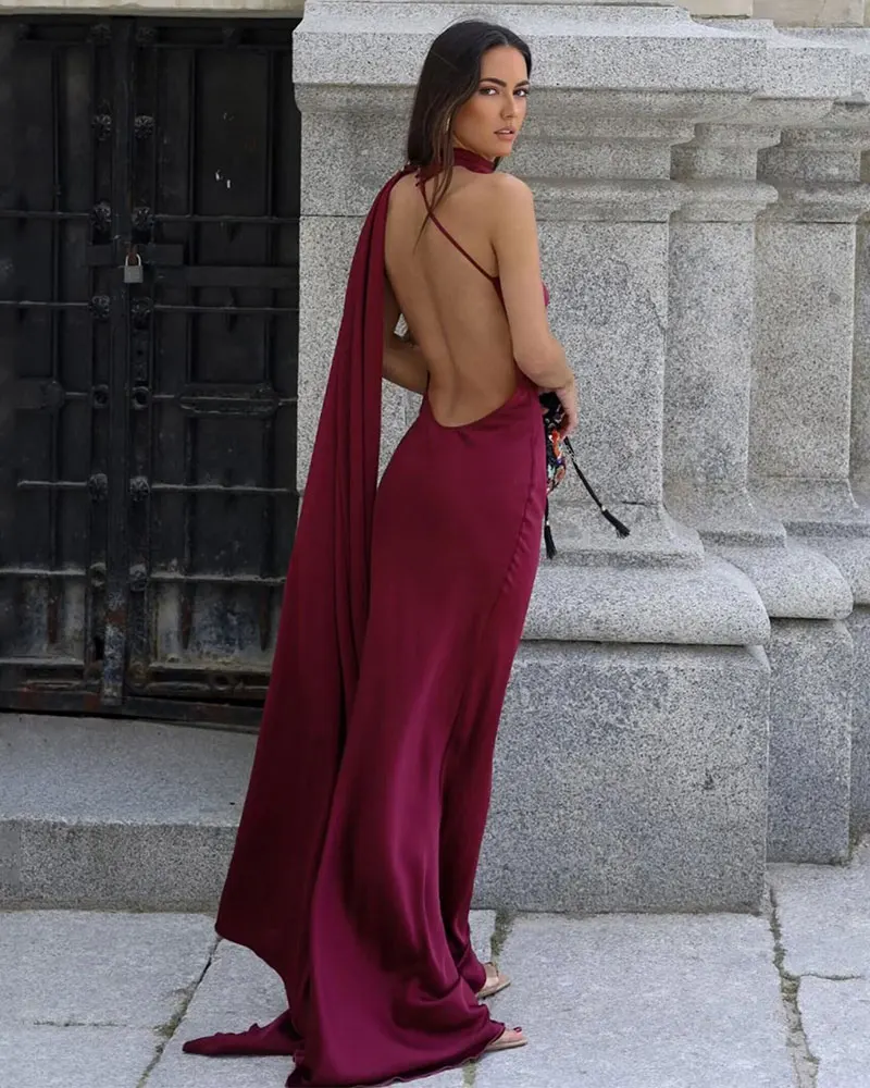 Satin Ribbon Halter Long Dresses Off Shoulder Backless Silky Temperament Slim Fit Elegant Women Club Party Maxi Dress
