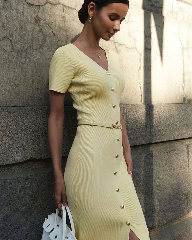 Elegant Knitwear V-Neck Single Breasted Long Dress Women Short Sleeve Fashion Vintage Office Female Knit Bodycon Dress