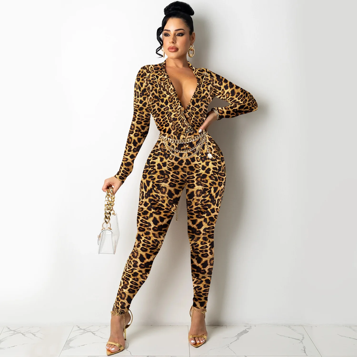 Leopard 2022 Sexy Outfits Winter Fall Spring Ladies Digital Printed v Neck Long Sleeve Club Party 2 Two Piece Pant Set for Women