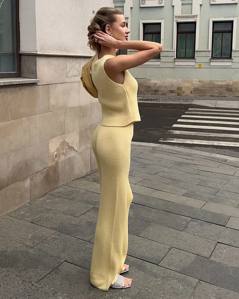 Knit Two Piece Sets Women Metal Button Crop Top and Wide Leg Pants Female Summer Slim Casual Pant Sets