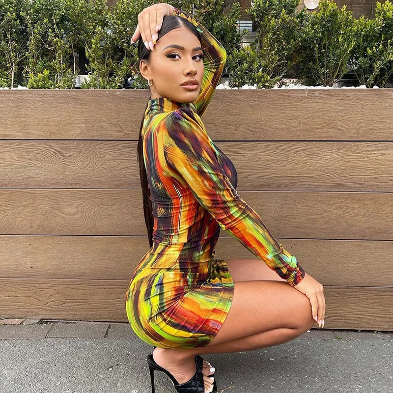 Tie Dye Women Long Sleeve Mini Dress Shoulder Pad Bodycon Sexy Streetwear Party 2025 Autumn Winter Clothes Y2K
