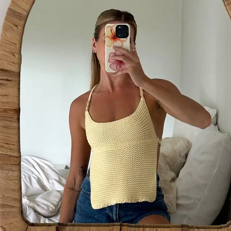 Summer Knit Crop Top Women Sweater Vest Y2k Streetwear Backless Lace-up Tank Tops Female Hollow Out Halter Sleeveless Top