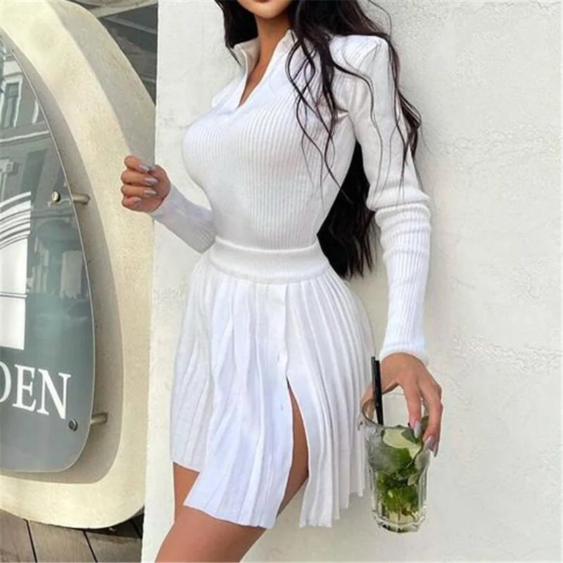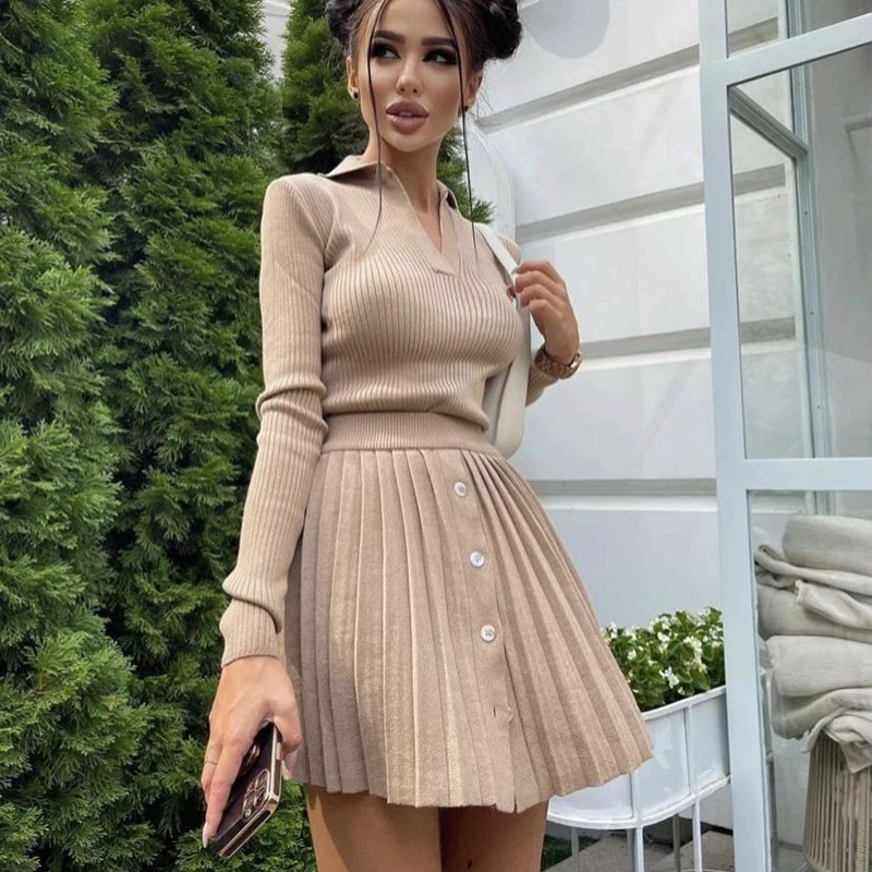 Knit Long Sleeve Sweater Dress Sets Women Polo Shirt Top and Skirts Suits Autumn Winter Two Piece Set Casual Outfit