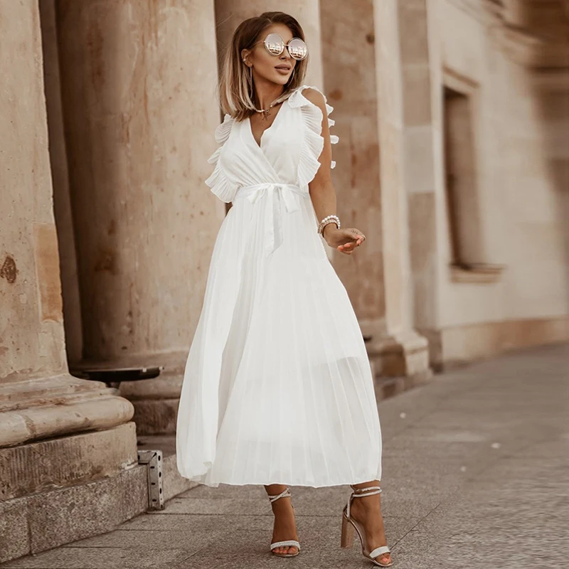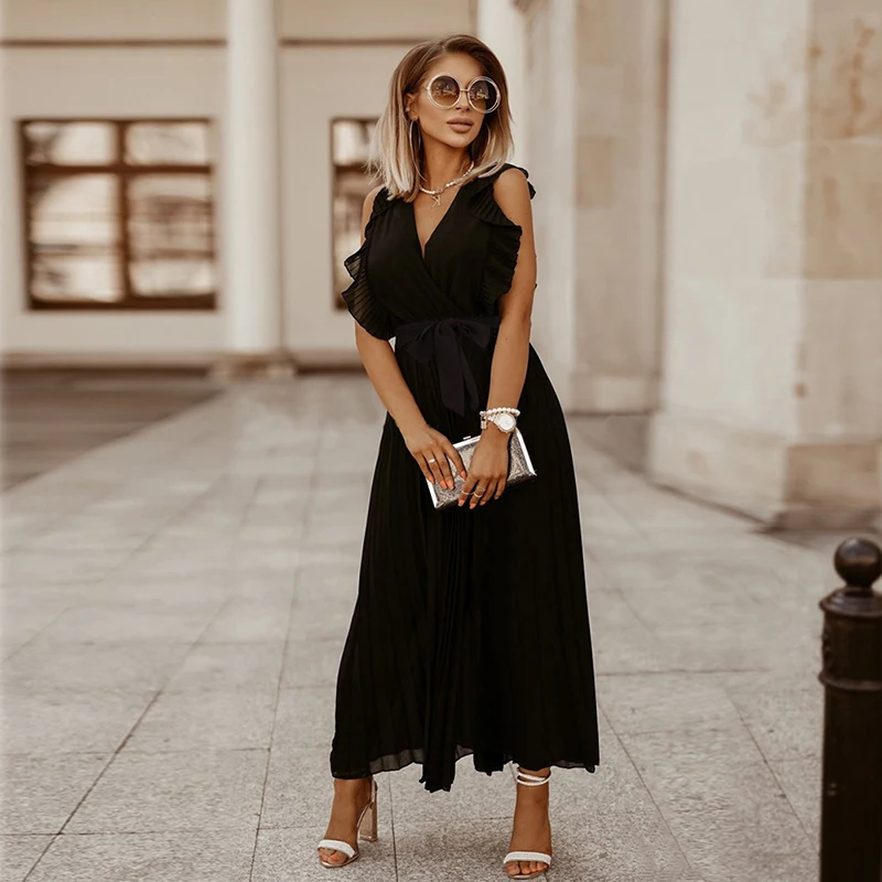 Chiffon Pleated Maxi Dress for Women With Belt 2022 Summer Elegant Slim Casual Long Party Dresses Vestidos
