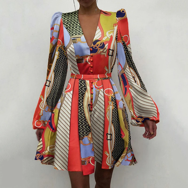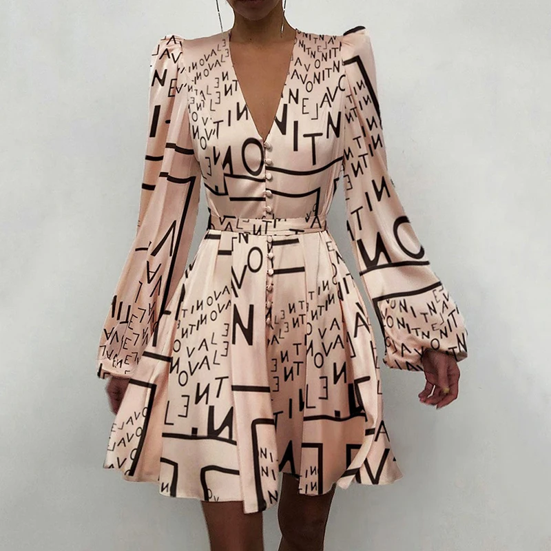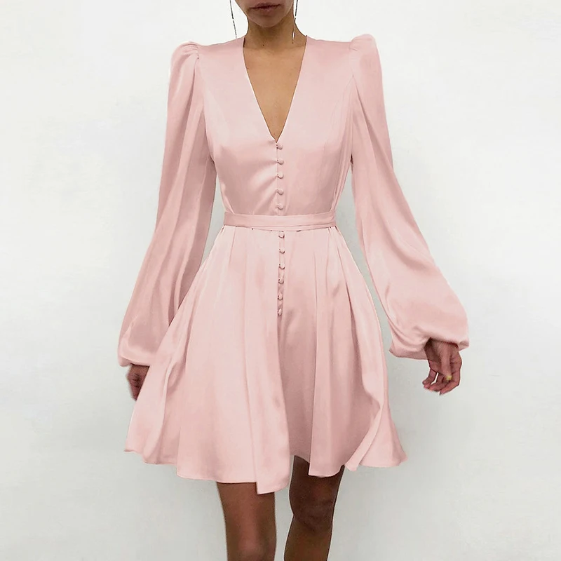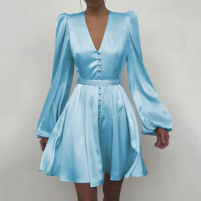 New Design Lantern Sleeve Mini A-Line Dress Summer Causal Ladies Satin Dress