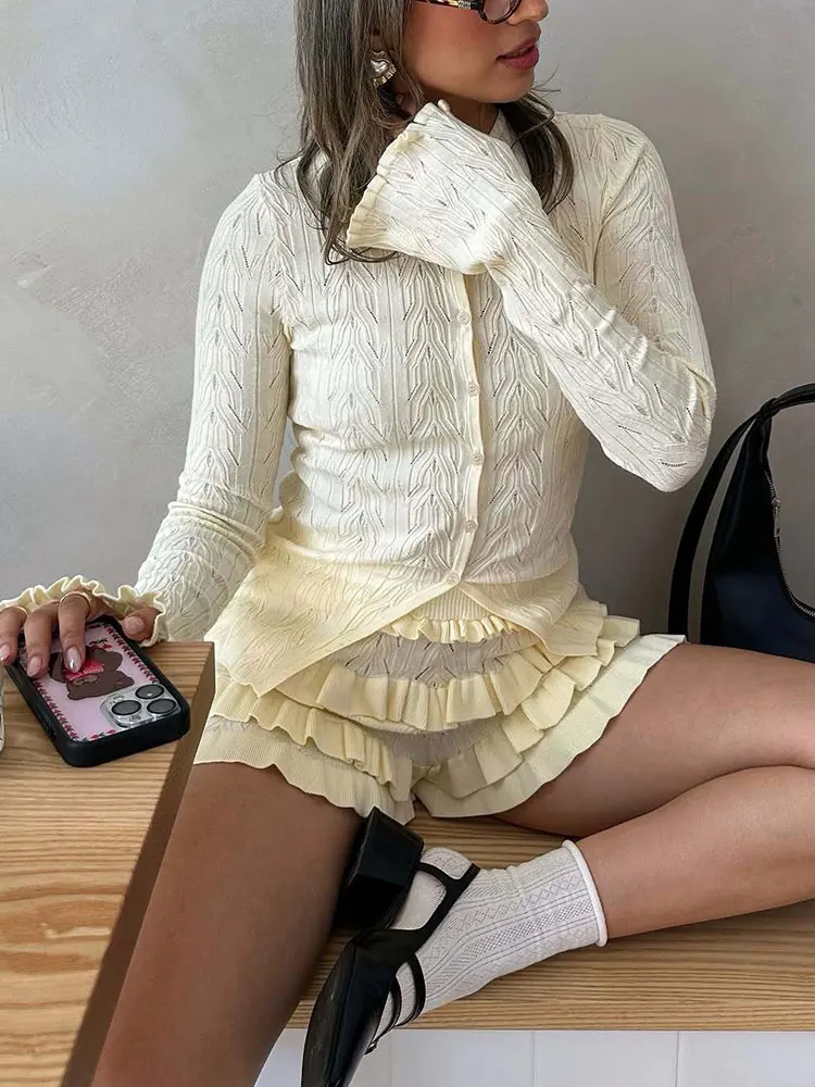 Knit Ruffled Two Piece Shorts Set Patchwork Slim Casual Long Sleeve Sweater Cardigan Women's Shorts Sets