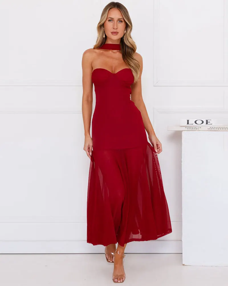 Scarf Collar Strapless Sexy Maxi Dress Women Gown Elegant Backless Sleeveless A-line Bodycon Club Party Long Dress