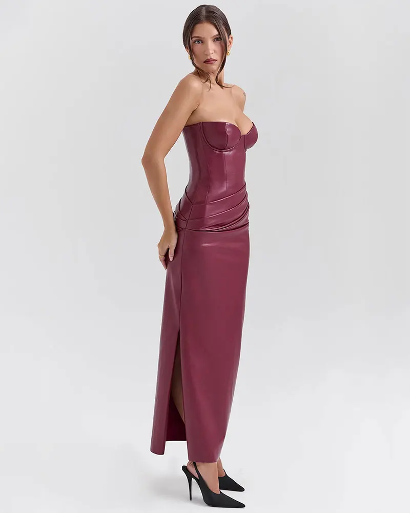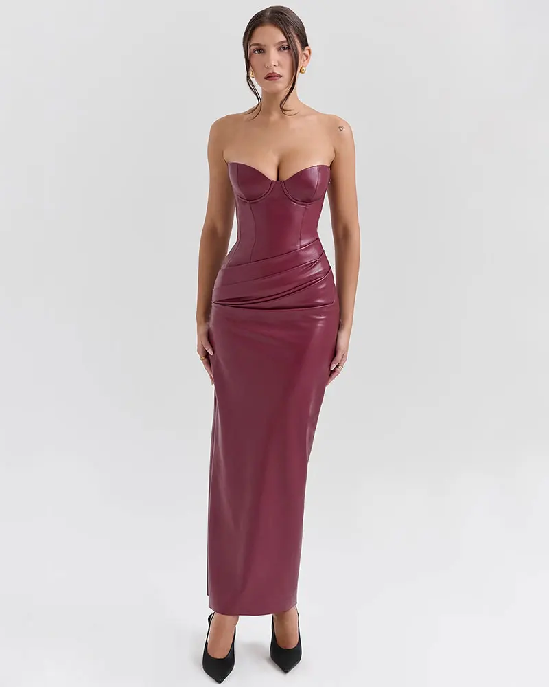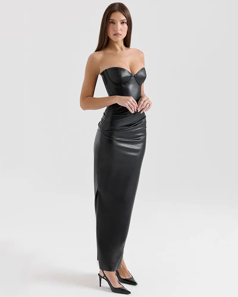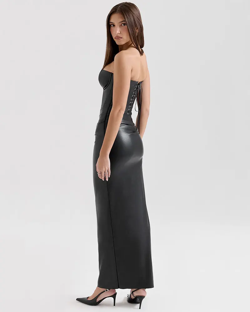 Strapless Sexy PU Leather Maxi Dress Women Fashion Off-shoulder Backless Lace-up Bodycon Club Party Long Dress