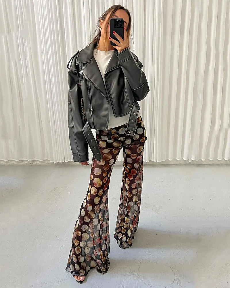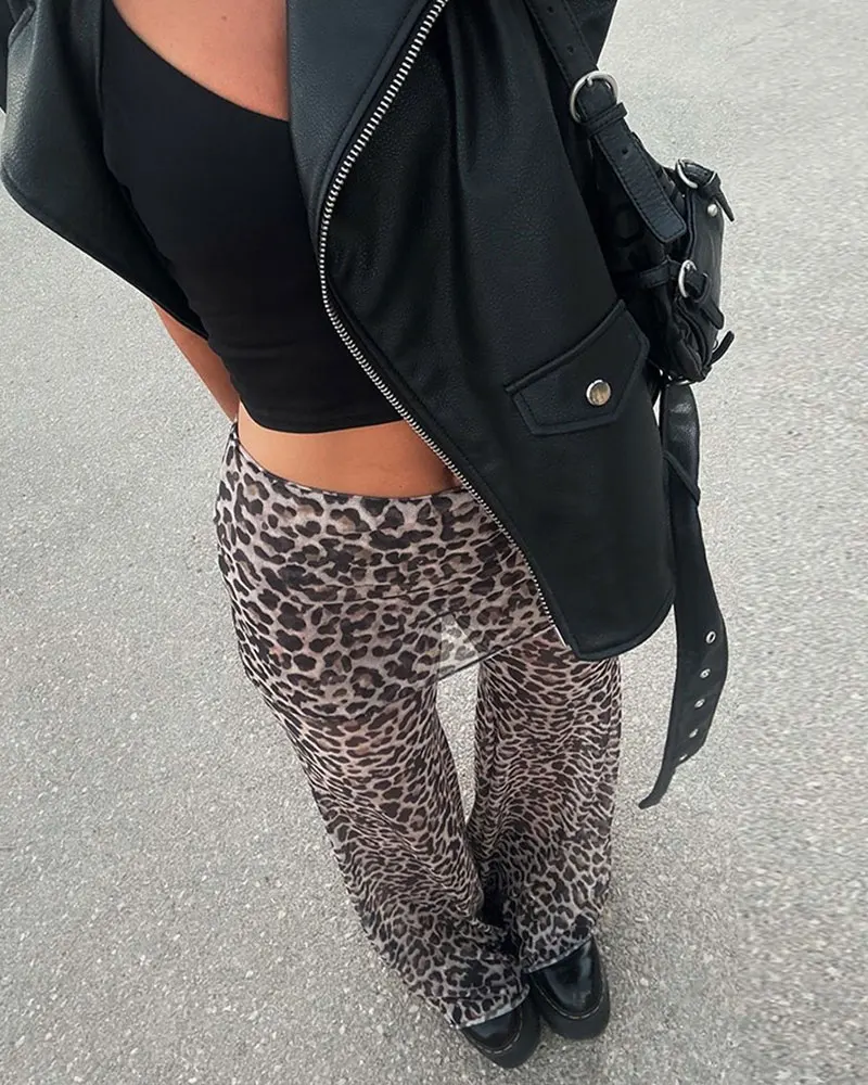 Mesh Leopard Print Trousers for Woman Summer Fashion Wide Leg Flare Pants Female Sexy Sheer Party Beachwear